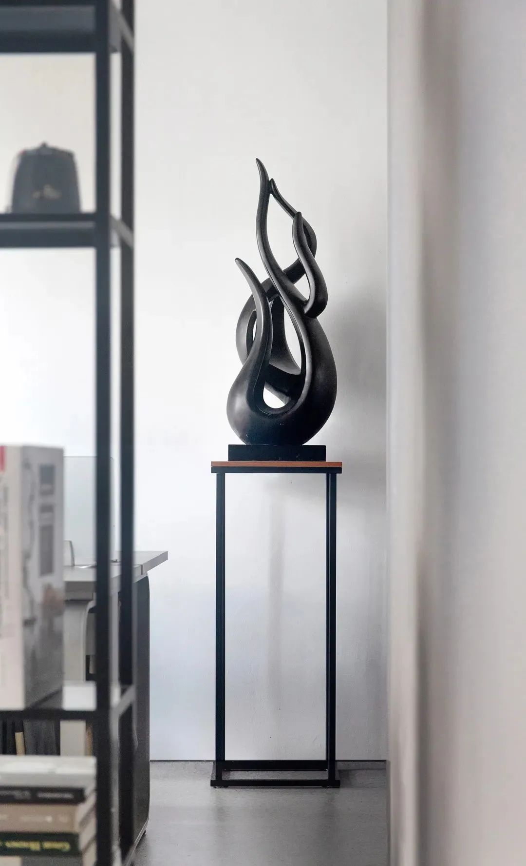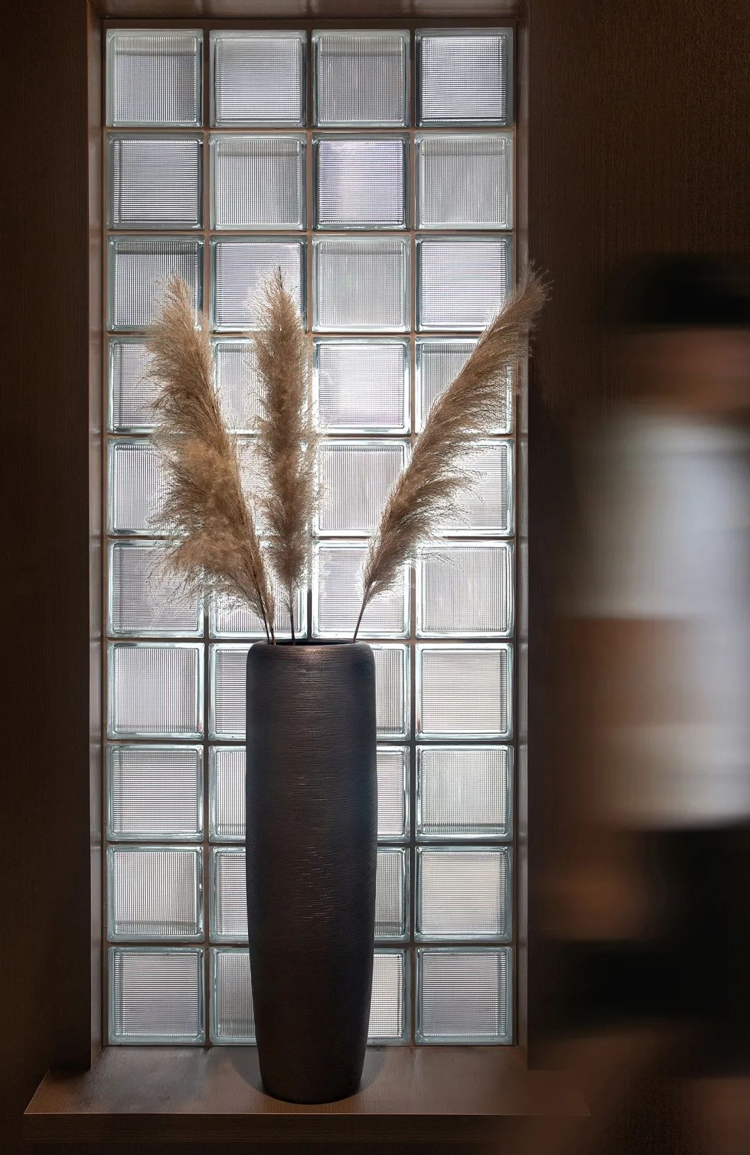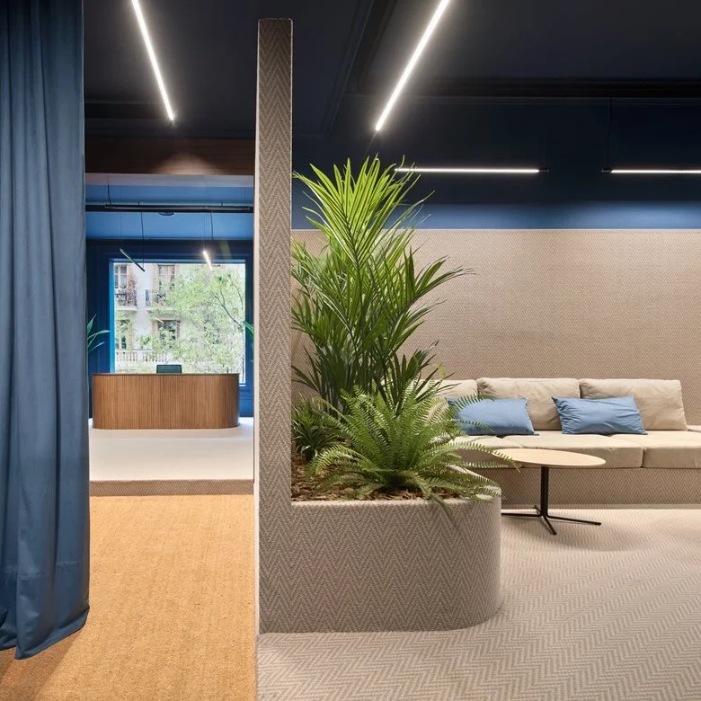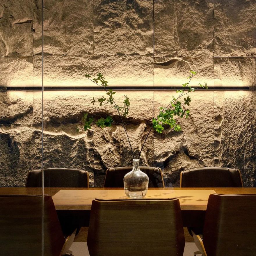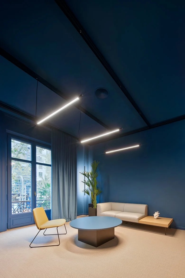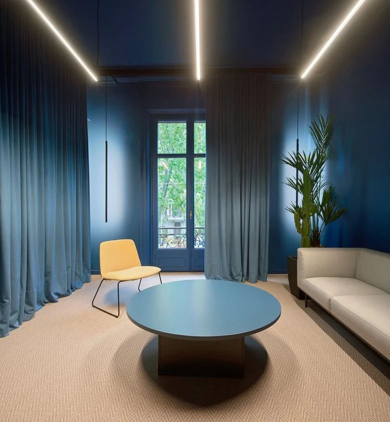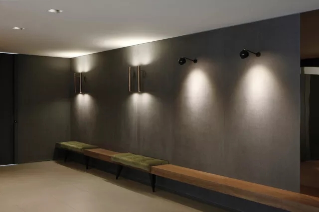 长廊连接会议室和办公室的入口,呈不对称设计。行政办公室和会议室一侧的墙面由美国胡桃木和边缘被切割成弧形的透明落地玻璃组成,内部朴素的标准办公空间一览无余。办公室的门由暗色木材制成,打断玻璃墙面,悬伸在空间之中。