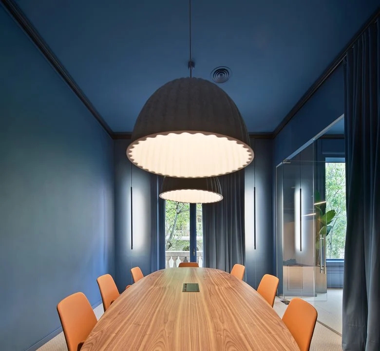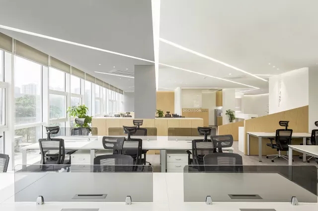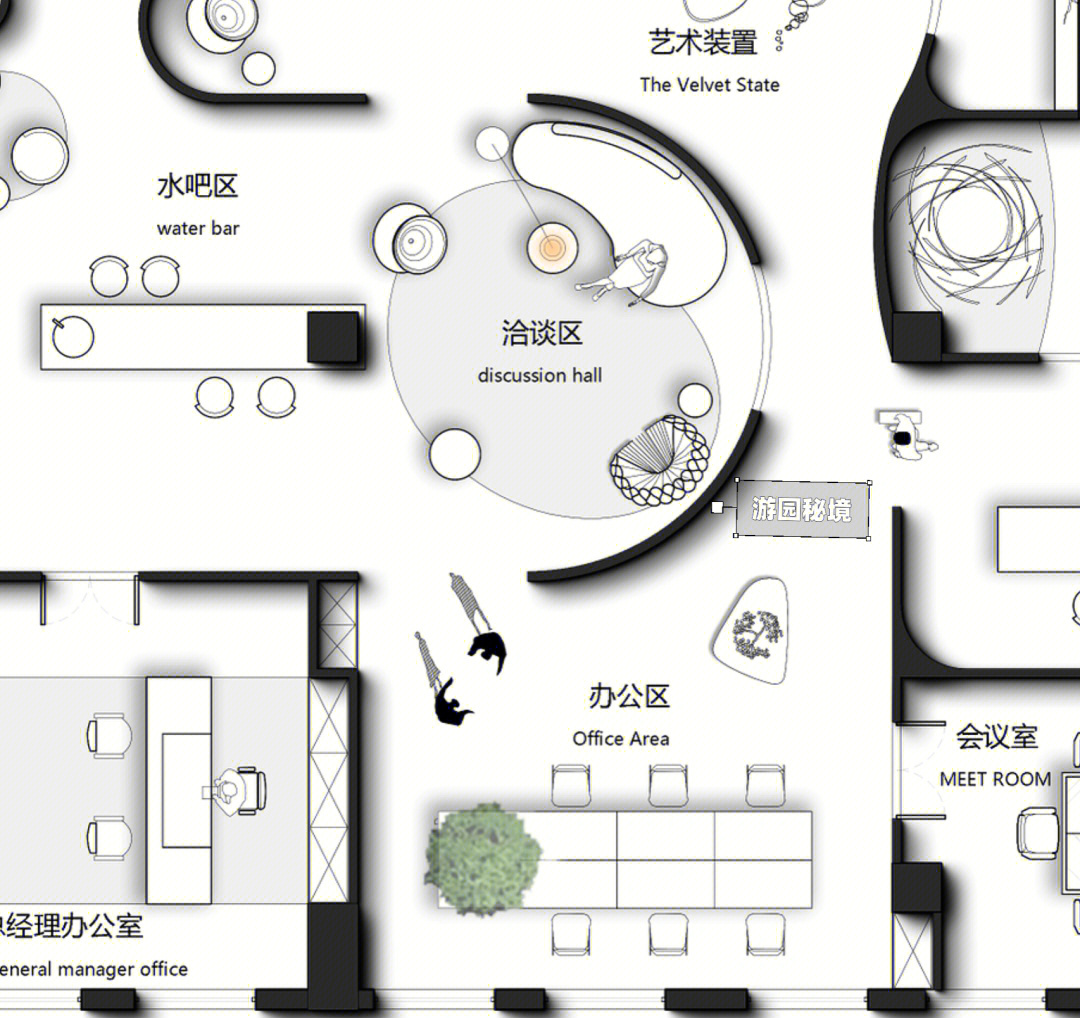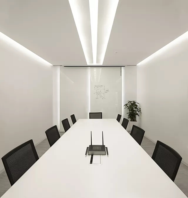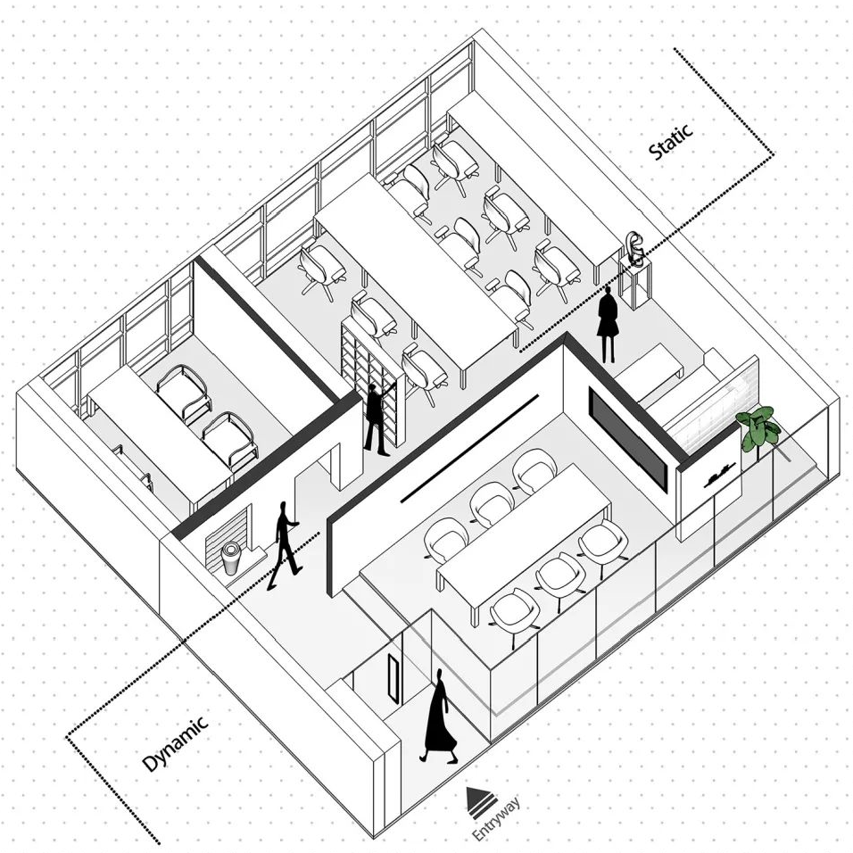 在不足250平米的使用面积上规划多功能办公环境本身就是尺寸之地,特别是设计任务中含有相当数量的开放办公位和独立办公室,要完成开始拟定的设计目标只在平面和立面上体现,显然是不足以的,于是我们把设计的核心转移到了天花。