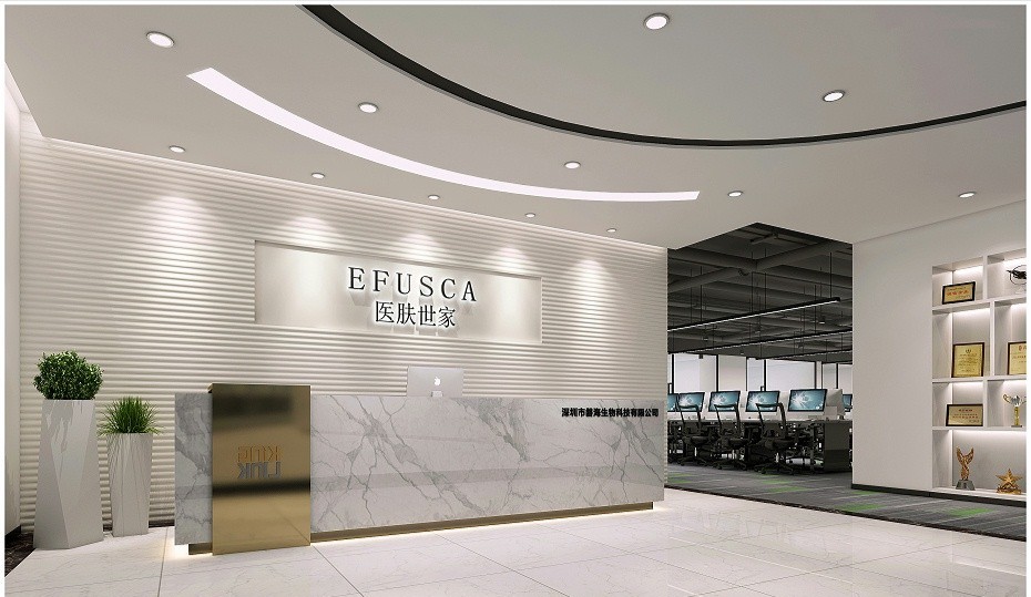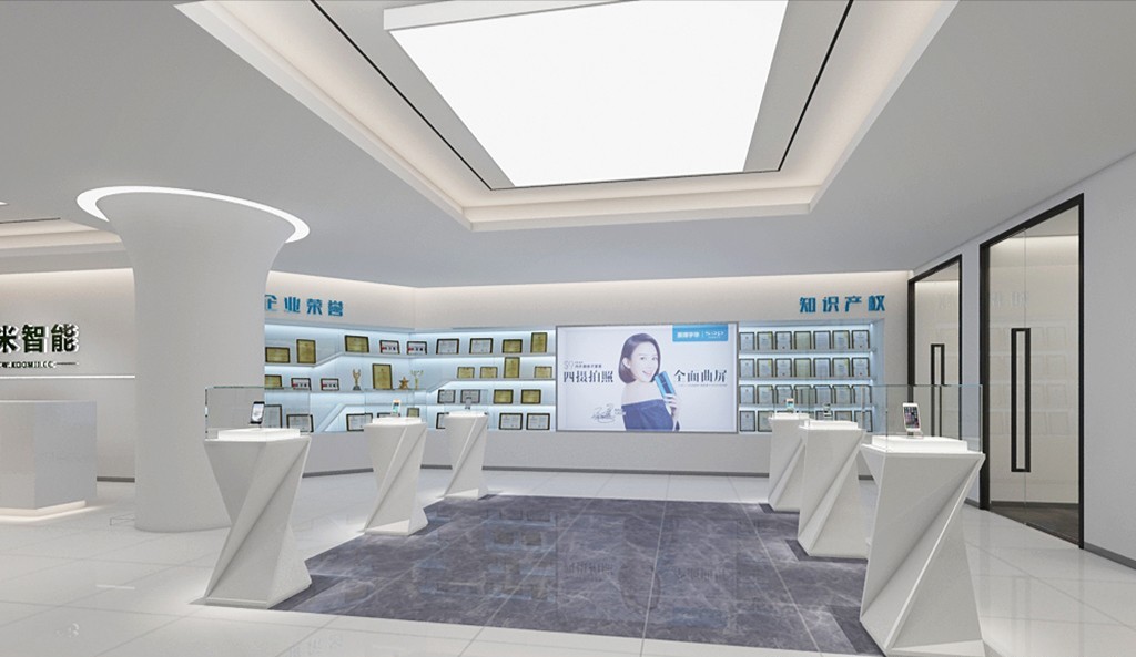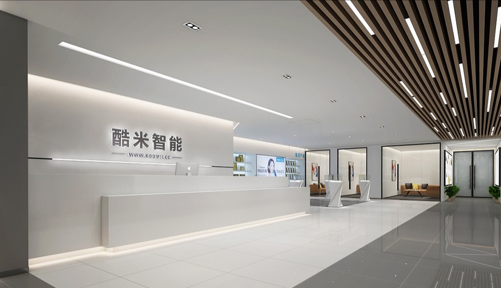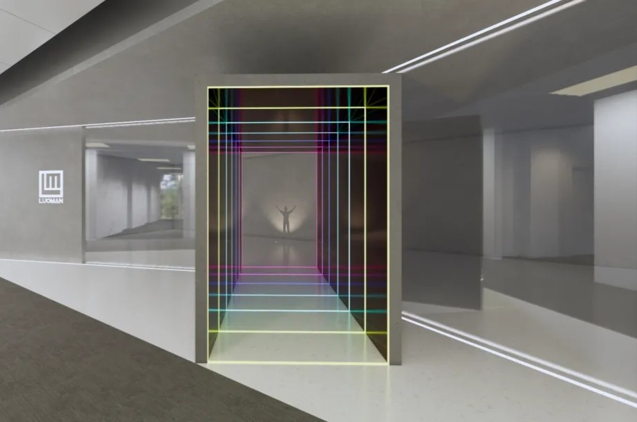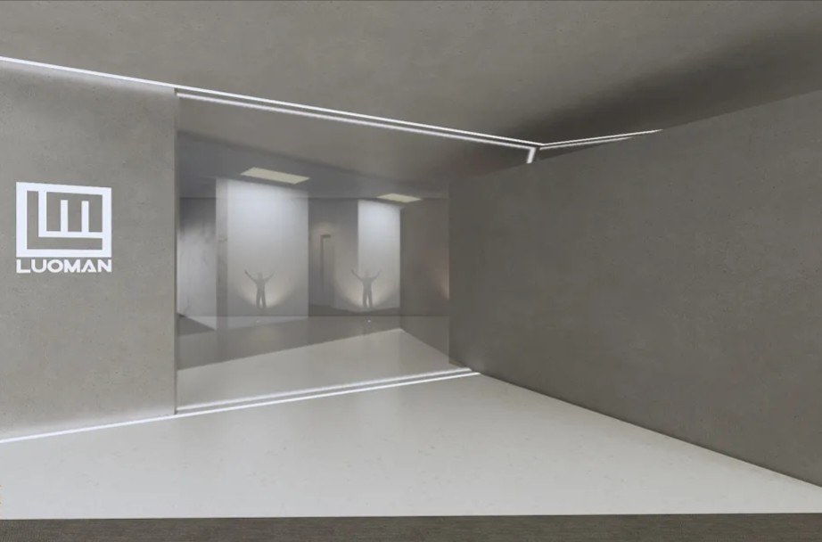 前厅灰色的墙面上缀以白色的公司Logo,简单直白地展示了公司形象,直击心底,印象深刻。此外,为了呼应公司主营业务,入口处更是利用光学原理打造出一个小型的“光学展示厅”,别出心裁,别有洞天。上下的灯带设计,整个空间感无限扩大;不同颜色光线直射、折射,使其像一个“时光穿越镜”,投射出的人物形象,手臂向上作出欢迎之势,又似迎接着未来,印证着公司主页Slogan:登高望远,照耀城市炫彩未来。
