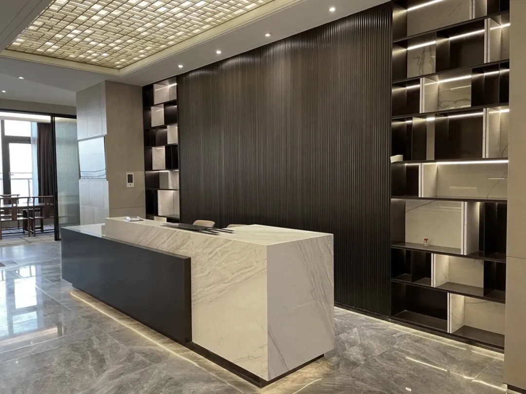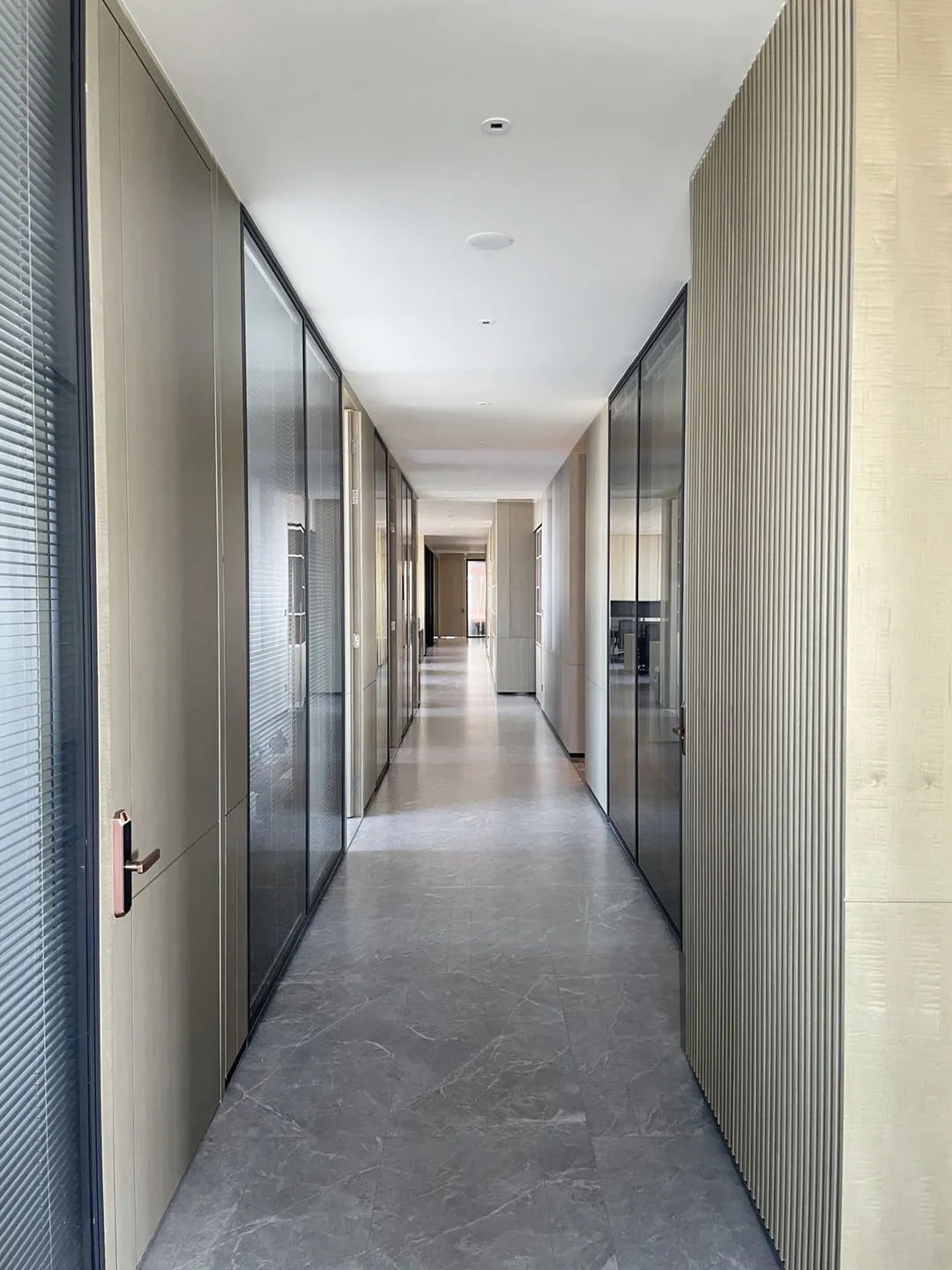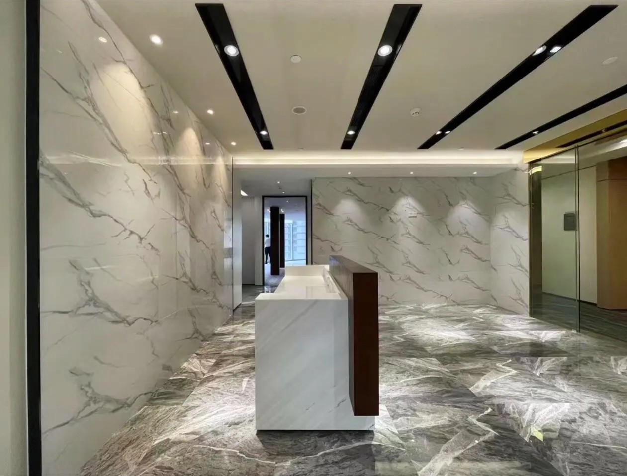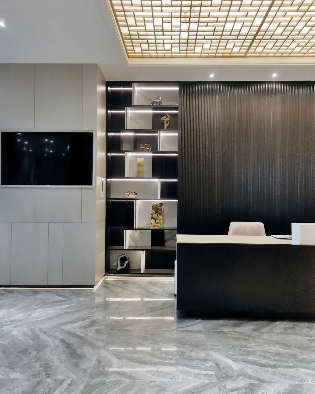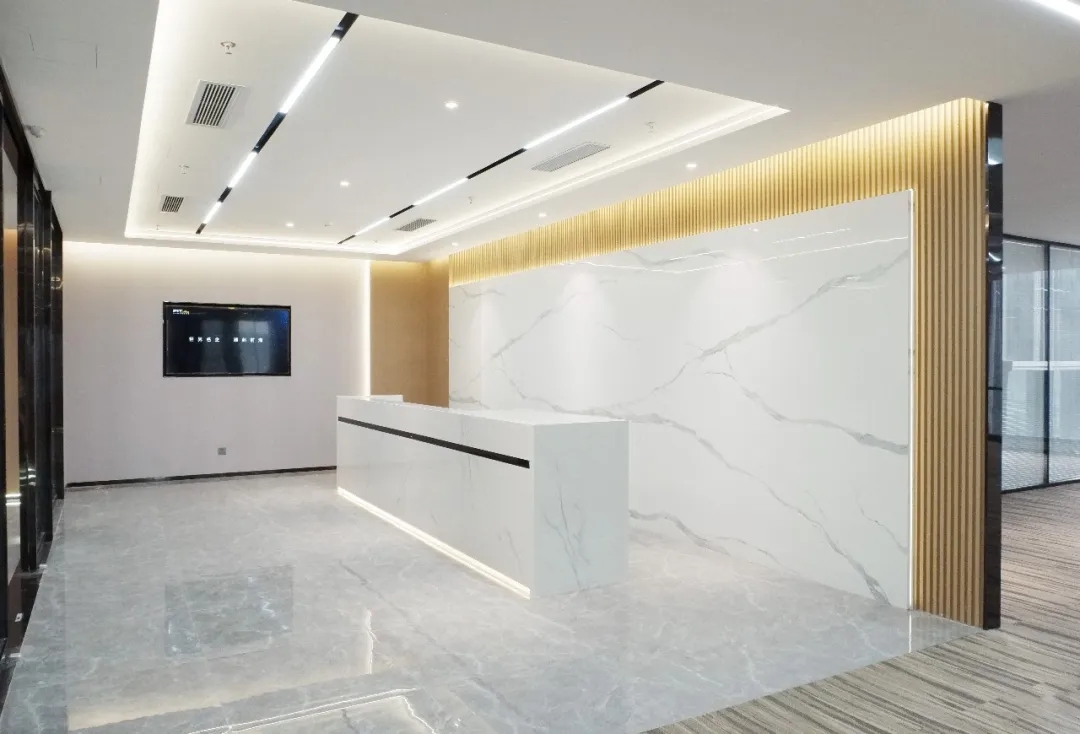 前台空间采用大面积大理石铺设,配合天花灯光大大提升了空间的亮度,给人以身心舒适的第一视觉体验。白色纹理大理石与亮黄色幕墙的搭配,缓和了大面积单色大理石带来的清冷感,更增添一份低调的奢华。办公区宽敞明亮,两侧透光,最大限度地利用自然光。设计时,设计师尽量减少了厚重墙体的堆设,在整体视觉体量上给人一种轻薄之感。除了淡黄色的使用,墙面颜色还巧妙地使用了烟熏紫,打破常规的配色,让整个设计不落俗套,却又增添了一抹古典优雅。