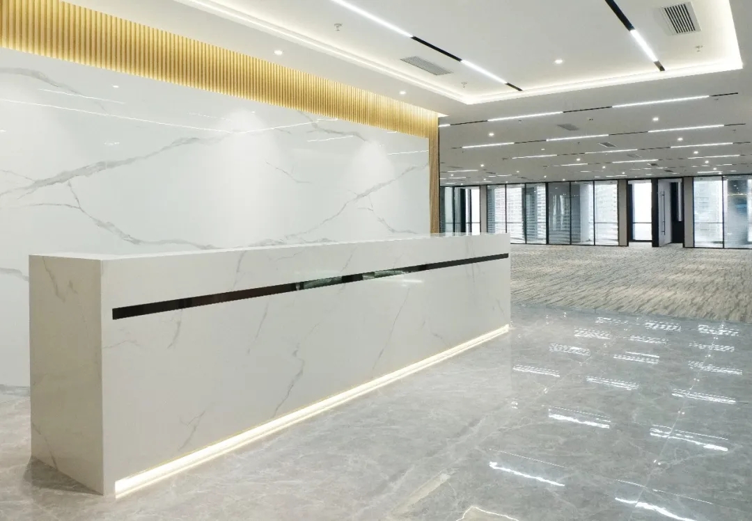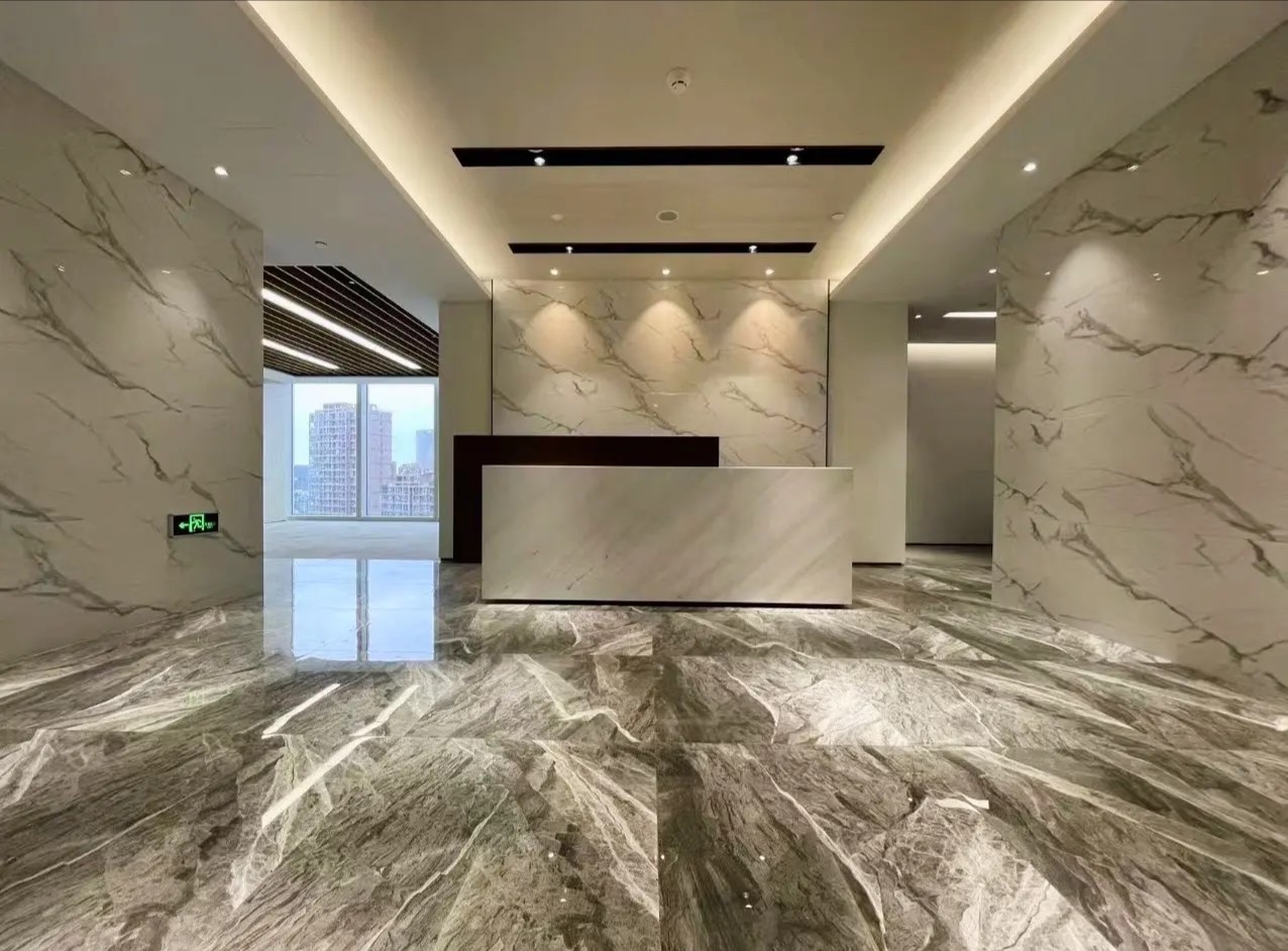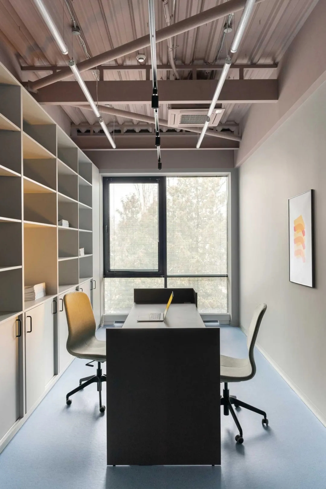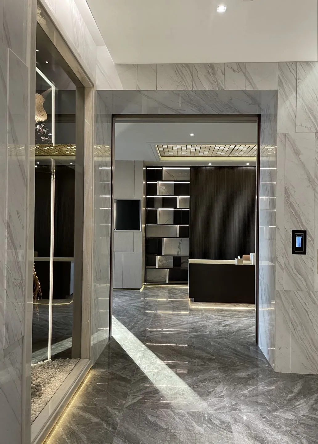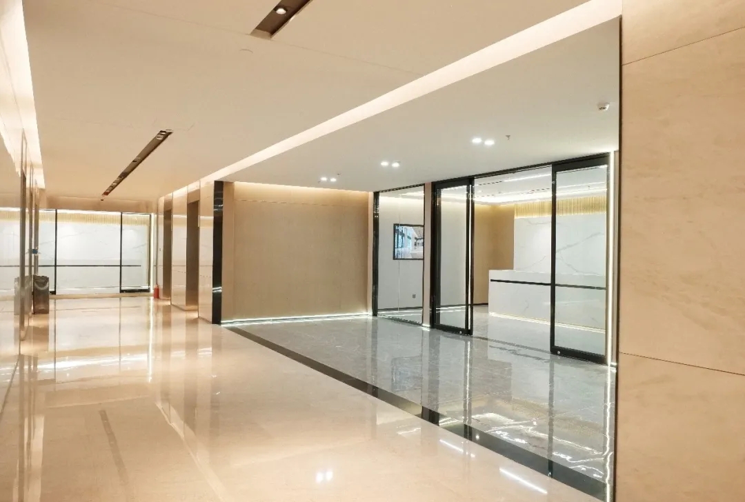 前台空间采用大面积大理石铺设,配合天花灯光大大提升了空间的亮度,给人以身心舒适的第一视觉体验。白色纹理大理石与亮黄色幕墙的搭配,缓和了大面积单色大理石带来的清冷感,更增添一份低调的奢华。办公区宽敞明亮,两侧透光,最大限度地利用自然光。设计时,设计师尽量减少了厚重墙体的堆设,在整体视觉体量上给人一种轻薄之感。除了淡黄色的使用,墙面颜色还巧妙地使用了烟熏紫,打破常规的配色,让整个设计不落俗套,却又增添了一抹古典优雅。