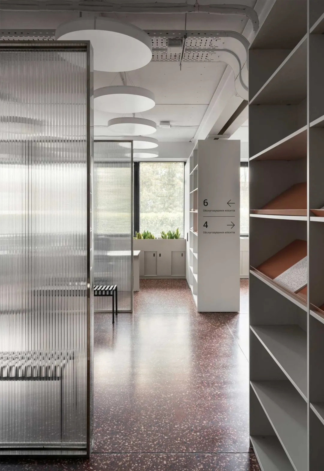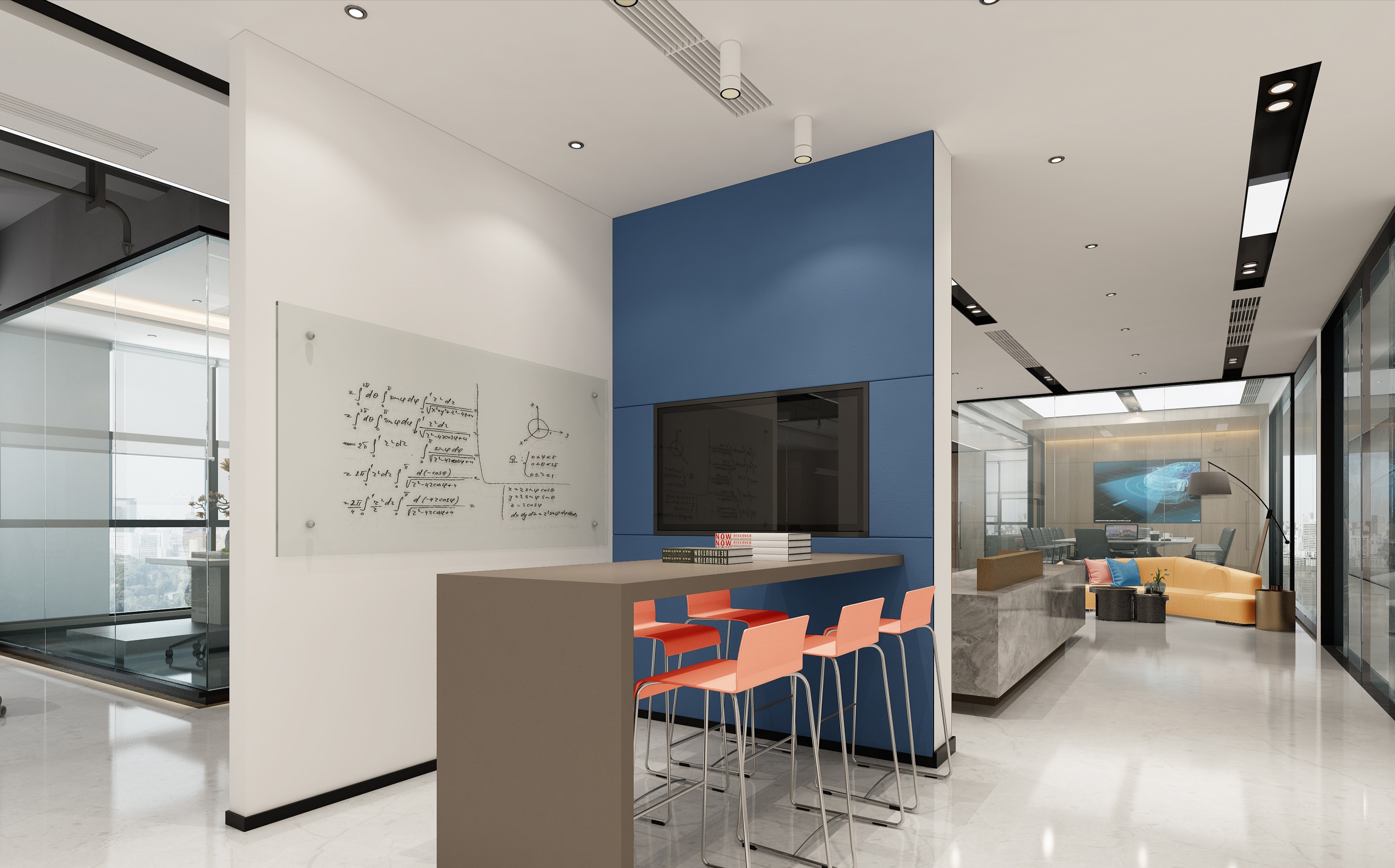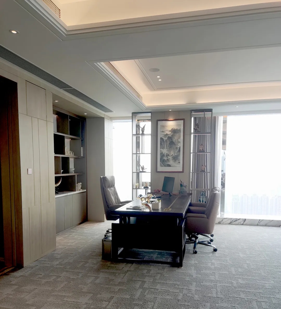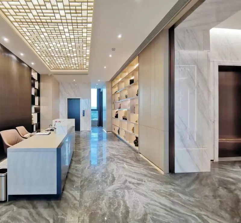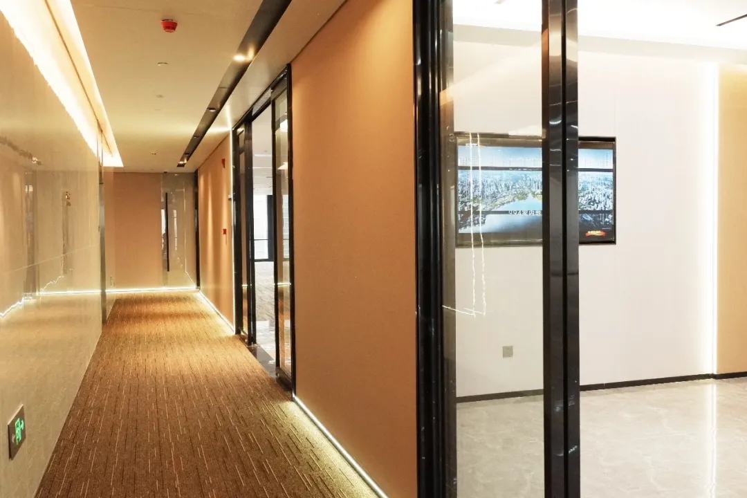 前台空间采用大面积大理石铺设,配合天花灯光大大提升了空间的亮度,给人以身心舒适的第一视觉体验。白色纹理大理石与亮黄色幕墙的搭配,缓和了大面积单色大理石带来的清冷感,更增添一份低调的奢华。办公区宽敞明亮,两侧透光,最大限度地利用自然光。设计时,设计师尽量减少了厚重墙体的堆设,在整体视觉体量上给人一种轻薄之感。除了淡黄色的使用,墙面颜色还巧妙地使用了烟熏紫,打破常规的配色,让整个设计不落俗套,却又增添了一抹古典优雅。