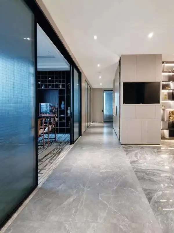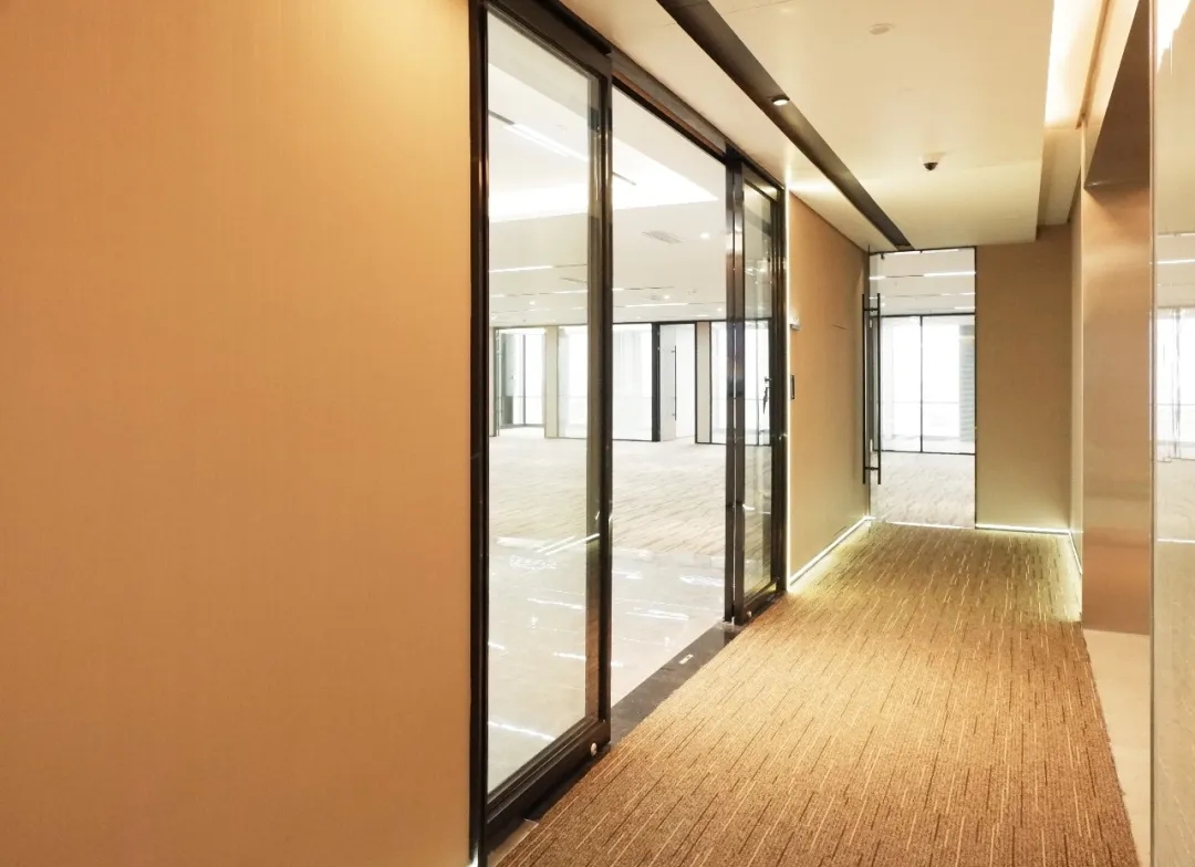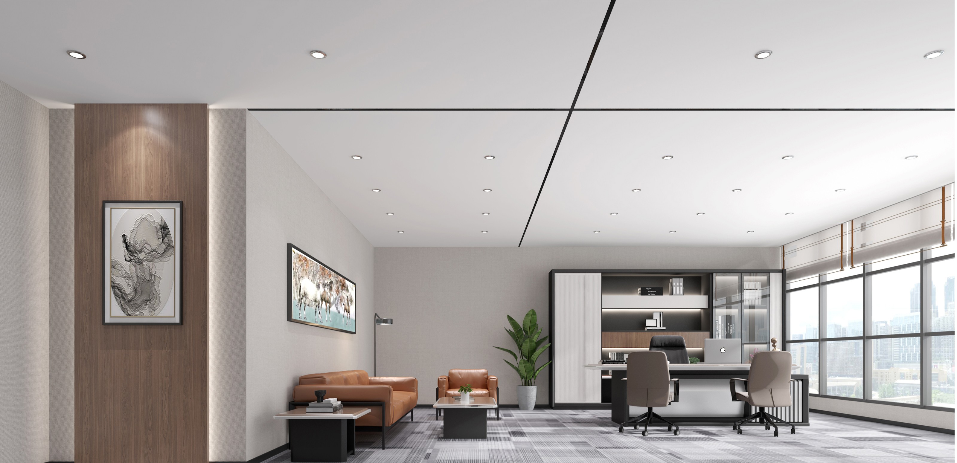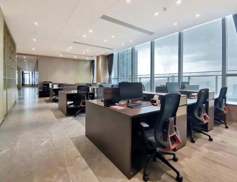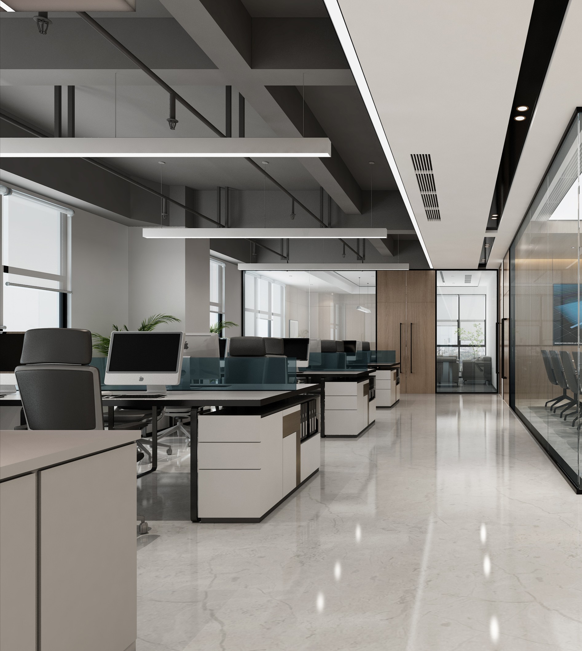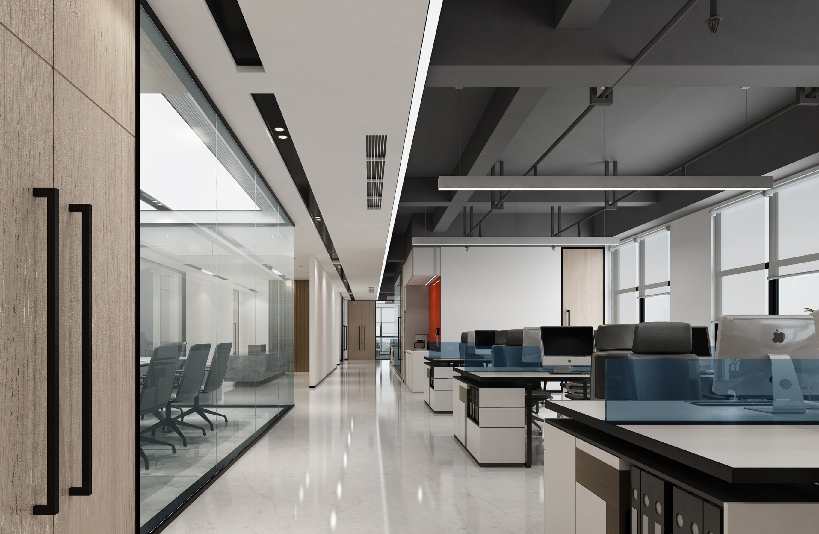 前台空间采用大面积大理石铺设,配合天花灯光大大提升了空间的亮度,给人以身心舒适的第一视觉体验。白色纹理大理石与亮黄色幕墙的搭配,缓和了大面积单色大理石带来的清冷感,更增添一份低调的奢华。办公区宽敞明亮,两侧透光,最大限度地利用自然光。设计时,设计师尽量减少了厚重墙体的堆设,在整体视觉体量上给人一种轻薄之感。除了淡黄色的使用,墙面颜色还巧妙地使用了烟熏紫,打破常规的配色,让整个设计不落俗套,却又增添了一抹古典优雅。