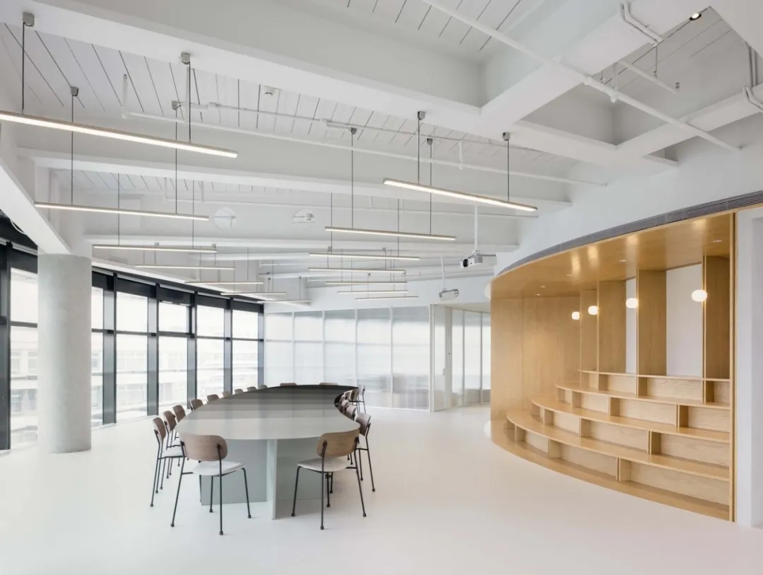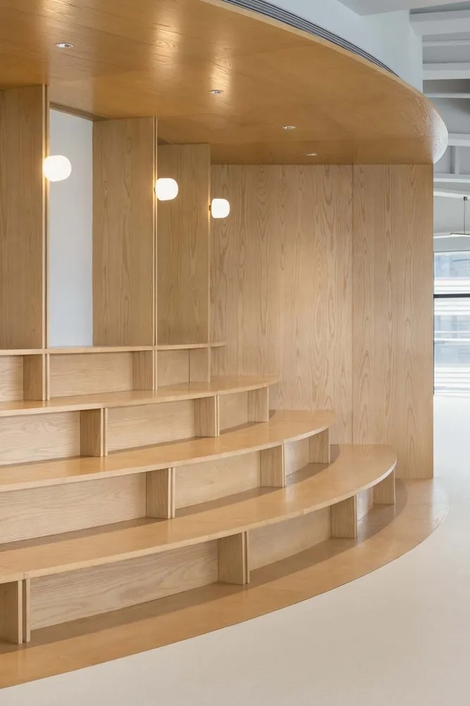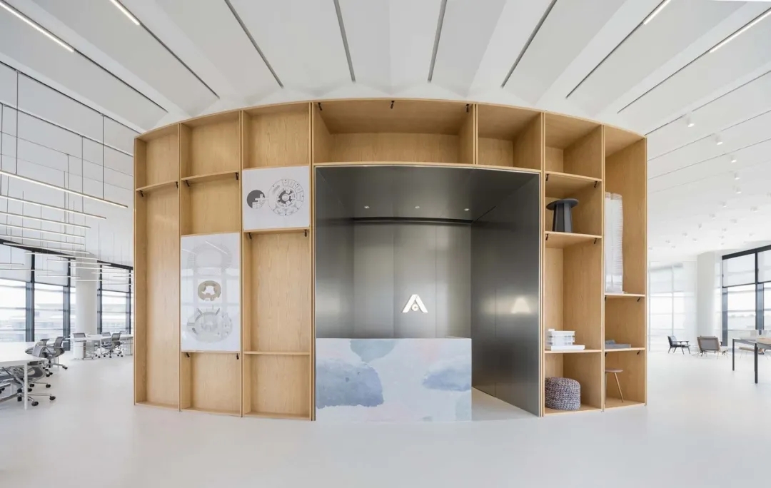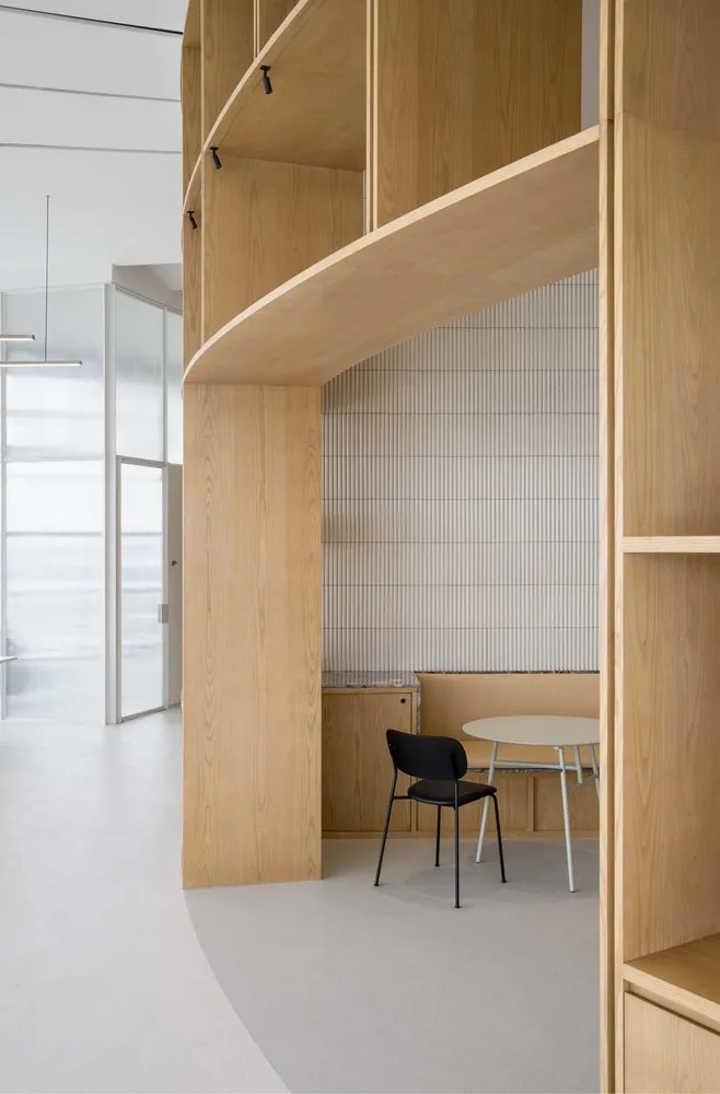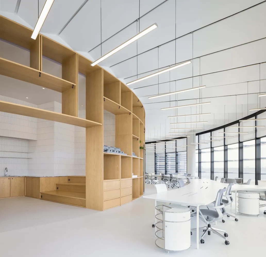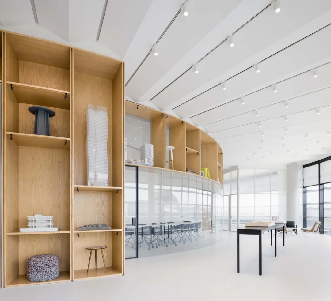 此次设计的办公室位于顶部两层。为充分体现建业的建筑成就,联图将整个圆形办公室设想为一个展览空间,用于展示建业的建筑模型、设计工具、材料样本、家具,以及建筑图纸。内嵌式木架包围中央圆形核心结构,隔出了会议室、办公室和茶水间,通过美术馆式的陈设,让建筑元素点缀整个空间。嵌入式结构不仅有助于激发面对面的交流与讨论,也能展示设计的过程和设计构思的成型。