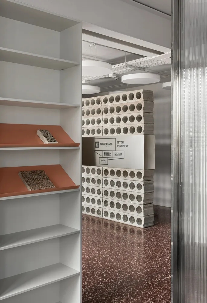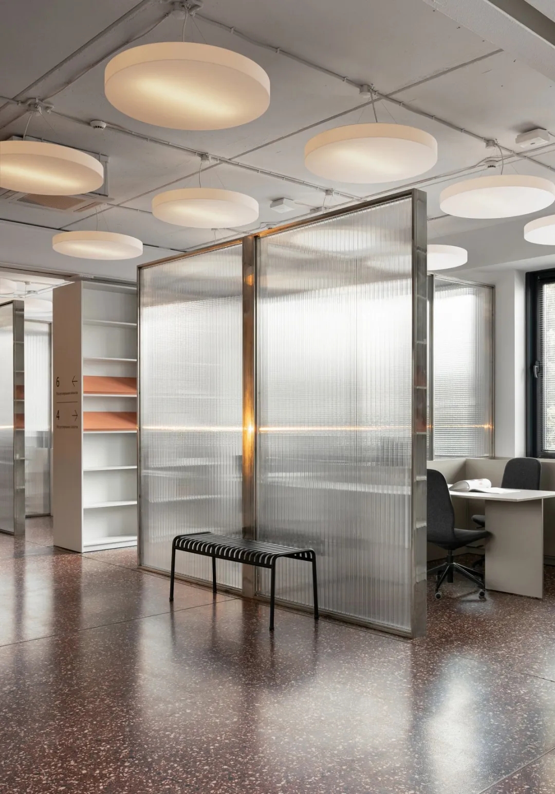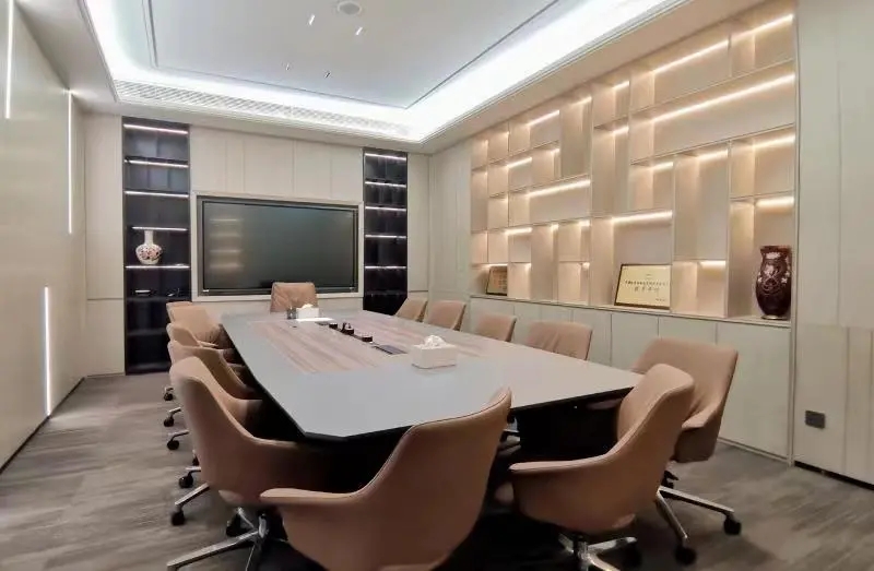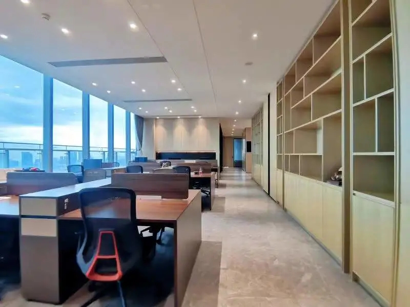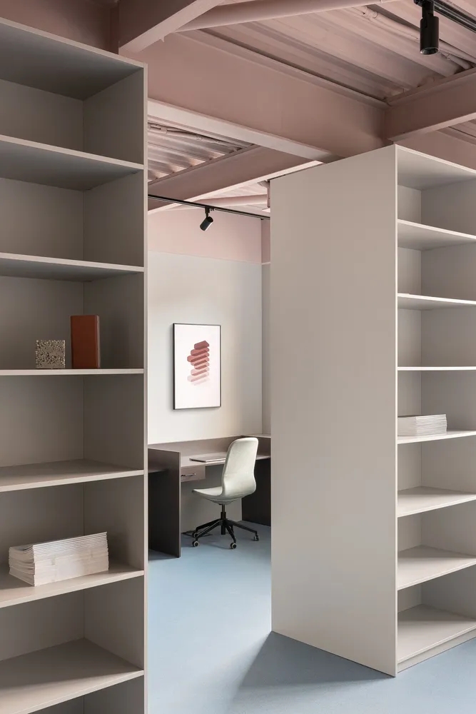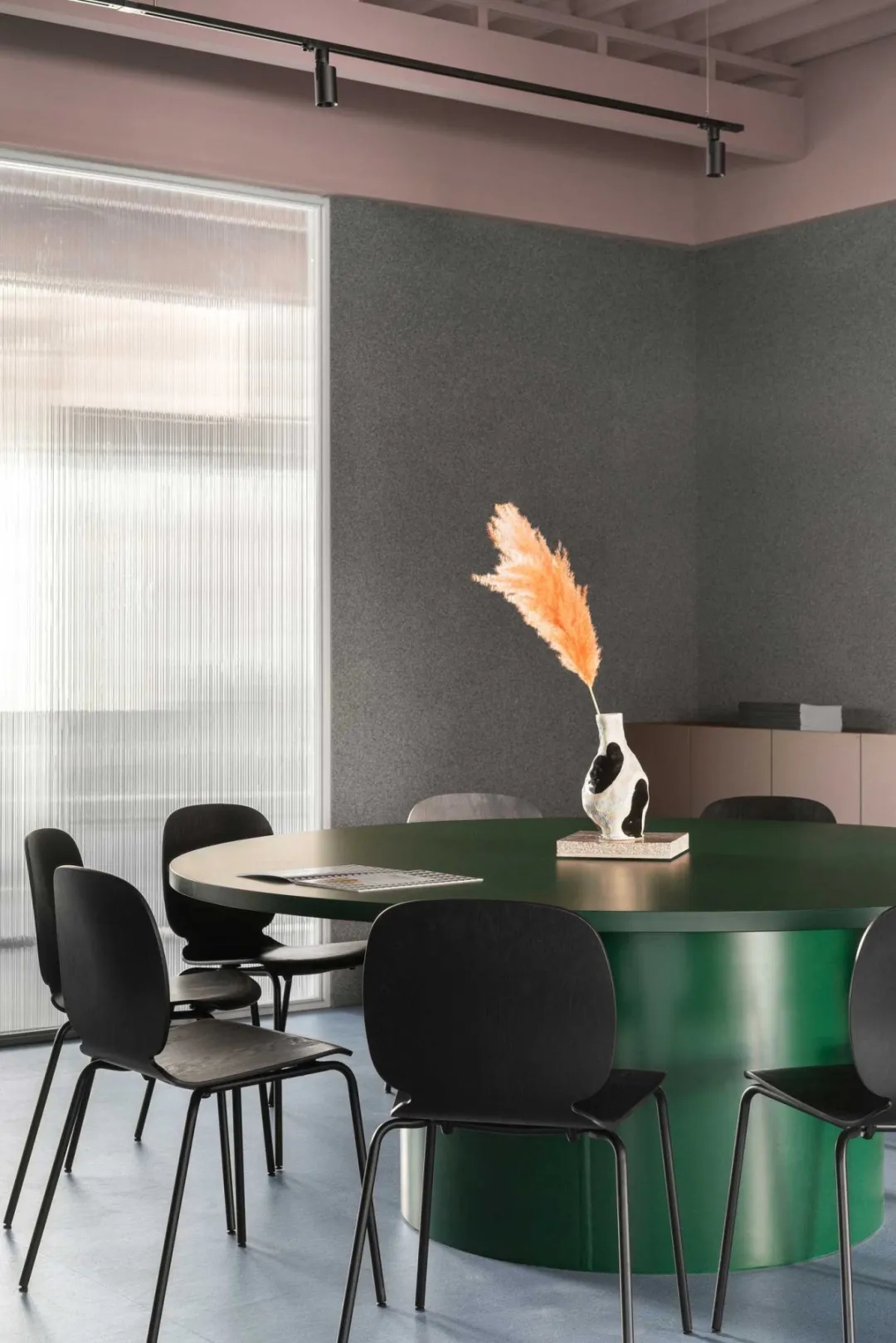 此次设计的办公室位于顶部两层。为充分体现建业的建筑成就,联图将整个圆形办公室设想为一个展览空间,用于展示建业的建筑模型、设计工具、材料样本、家具,以及建筑图纸。内嵌式木架包围中央圆形核心结构,隔出了会议室、办公室和茶水间,通过美术馆式的陈设,让建筑元素点缀整个空间。嵌入式结构不仅有助于激发面对面的交流与讨论,也能展示设计的过程和设计构思的成型。