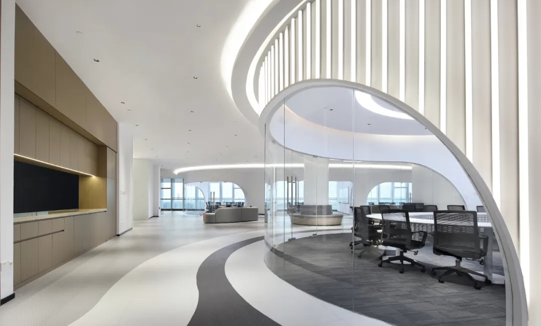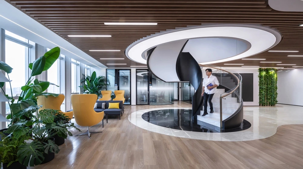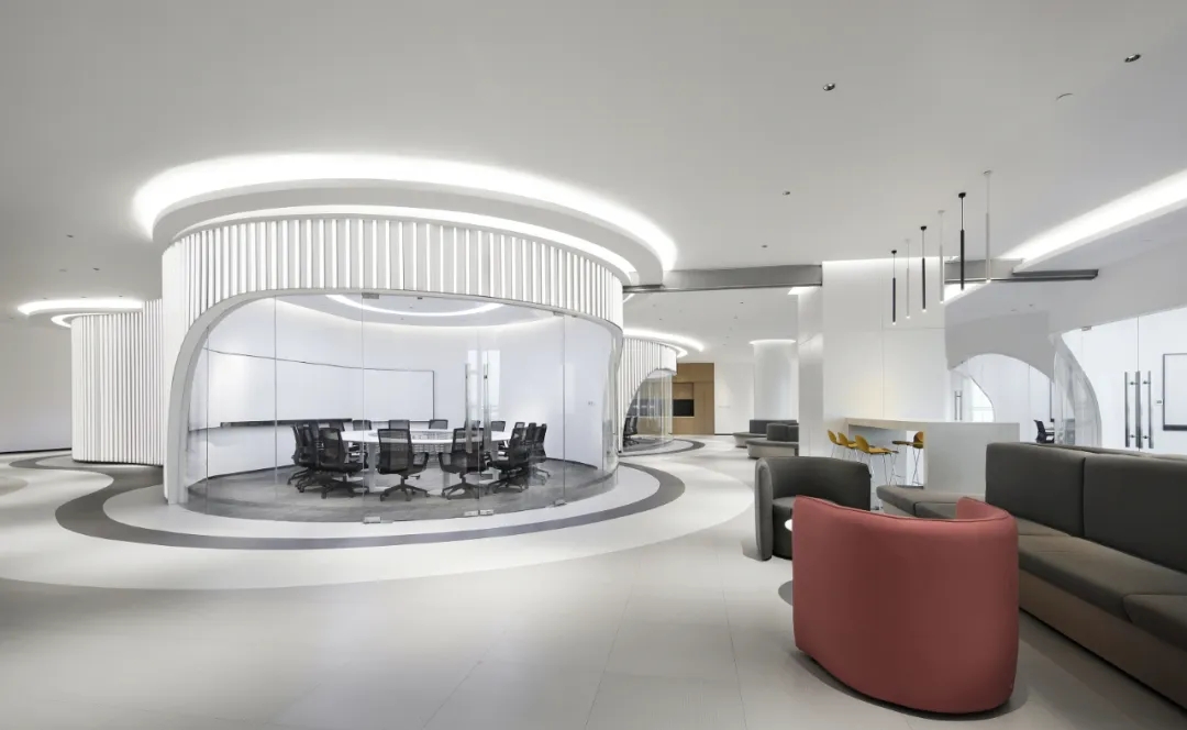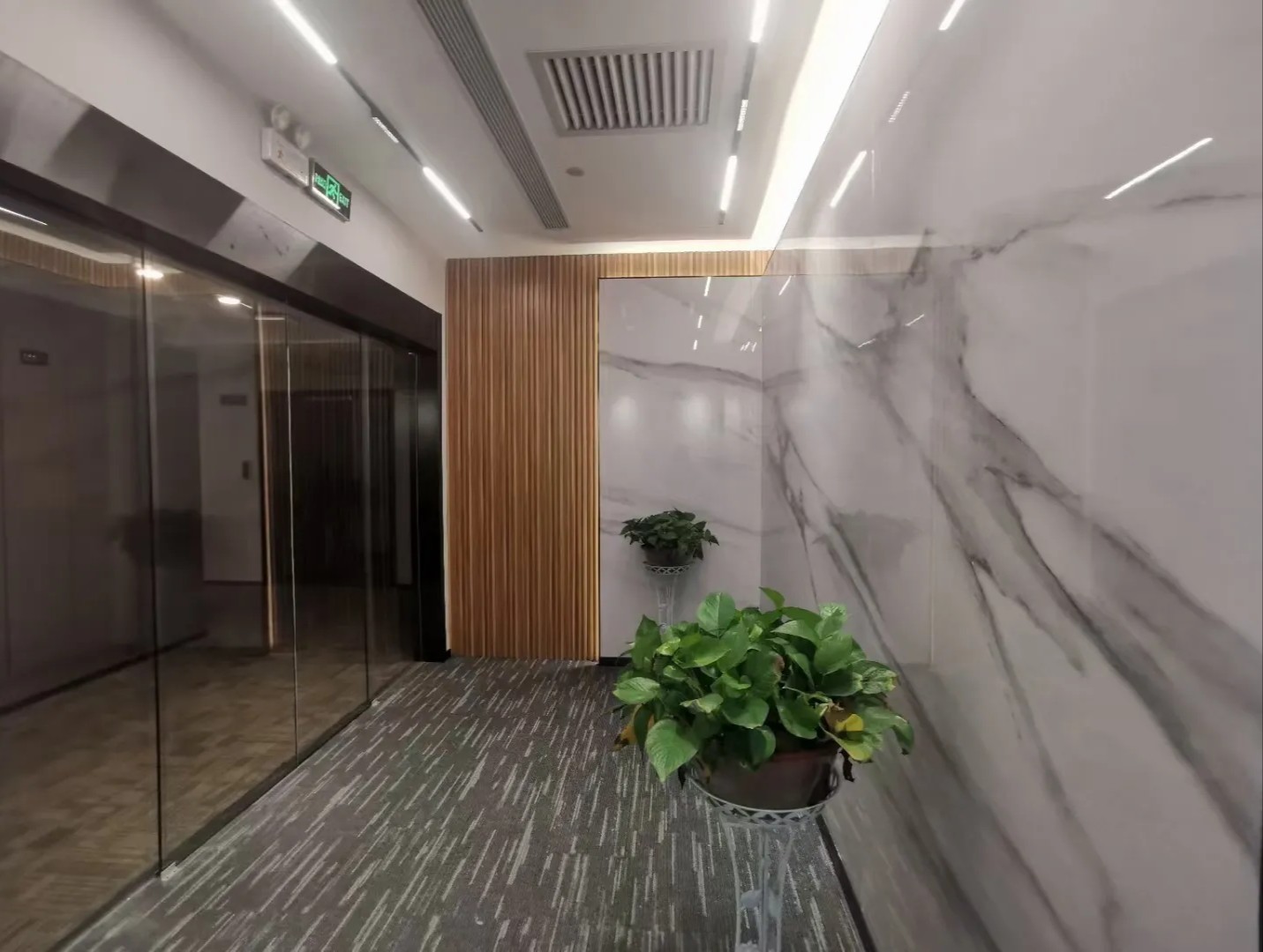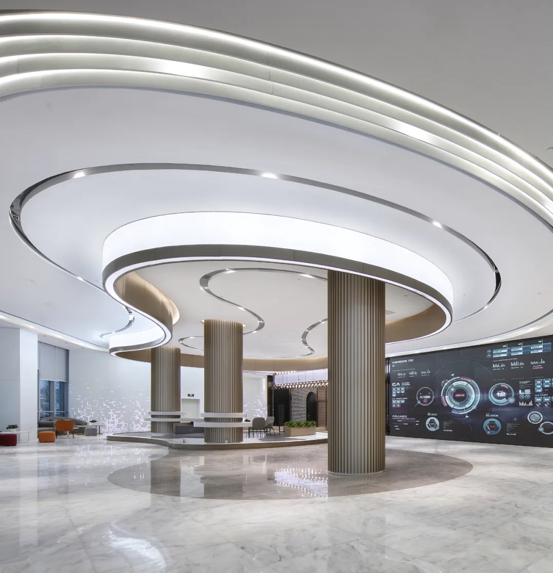 在这里,可听叠水潺潺,观树影婆娑,是瞬间能让心灵回归到大自然的幽静之所。围绕“海岛”四周,LED大屏展示区、沙发接待区等功能区依次展开。