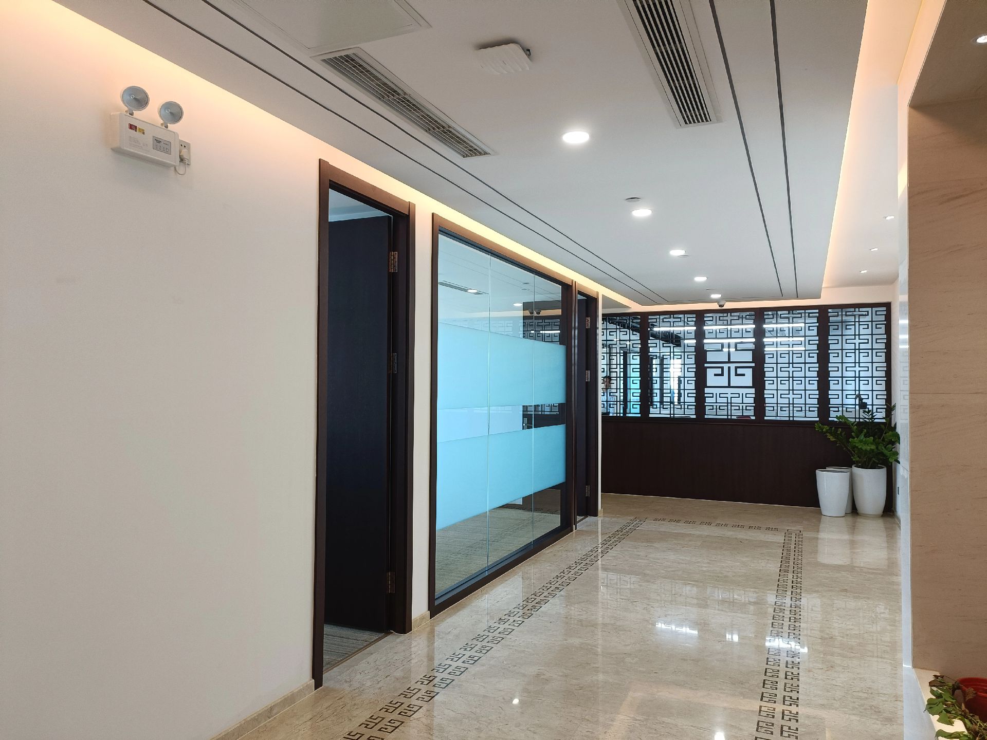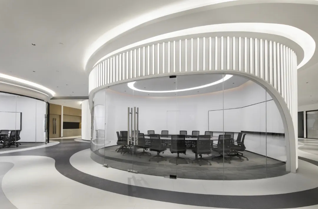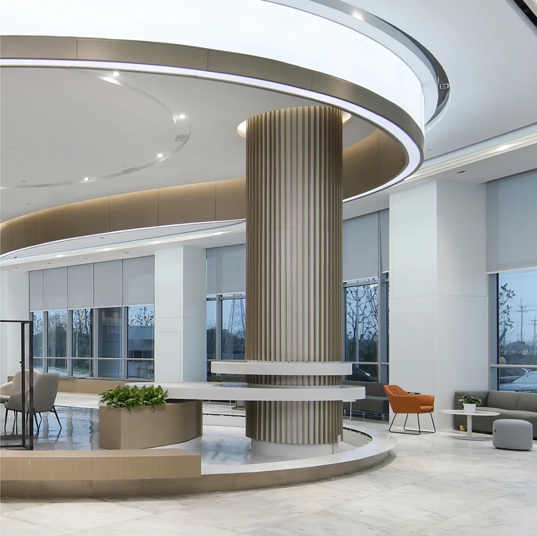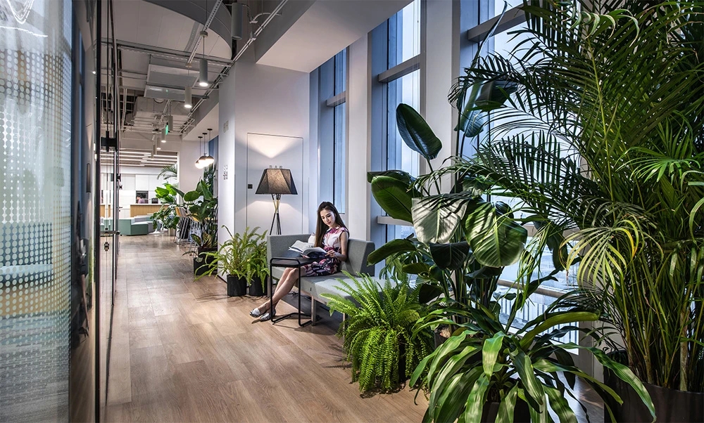 在这里,可听叠水潺潺,观树影婆娑,是瞬间能让心灵回归到大自然的幽静之所。围绕“海岛”四周,LED大屏展示区、沙发接待区等功能区依次展开。
