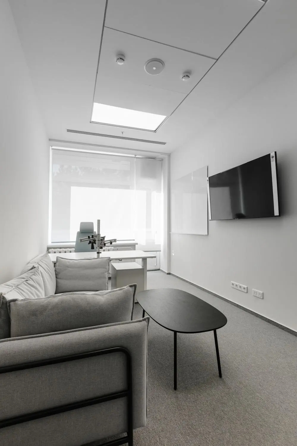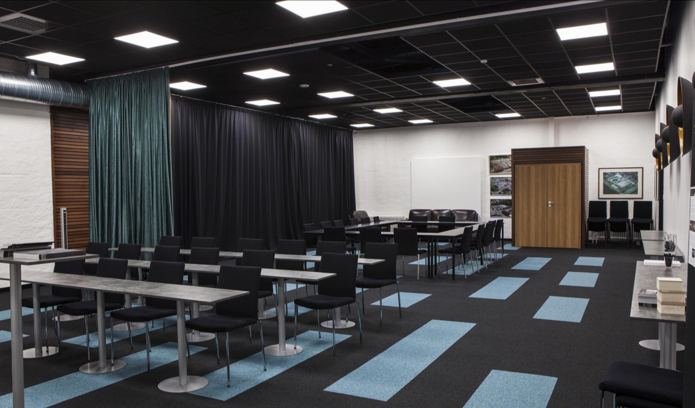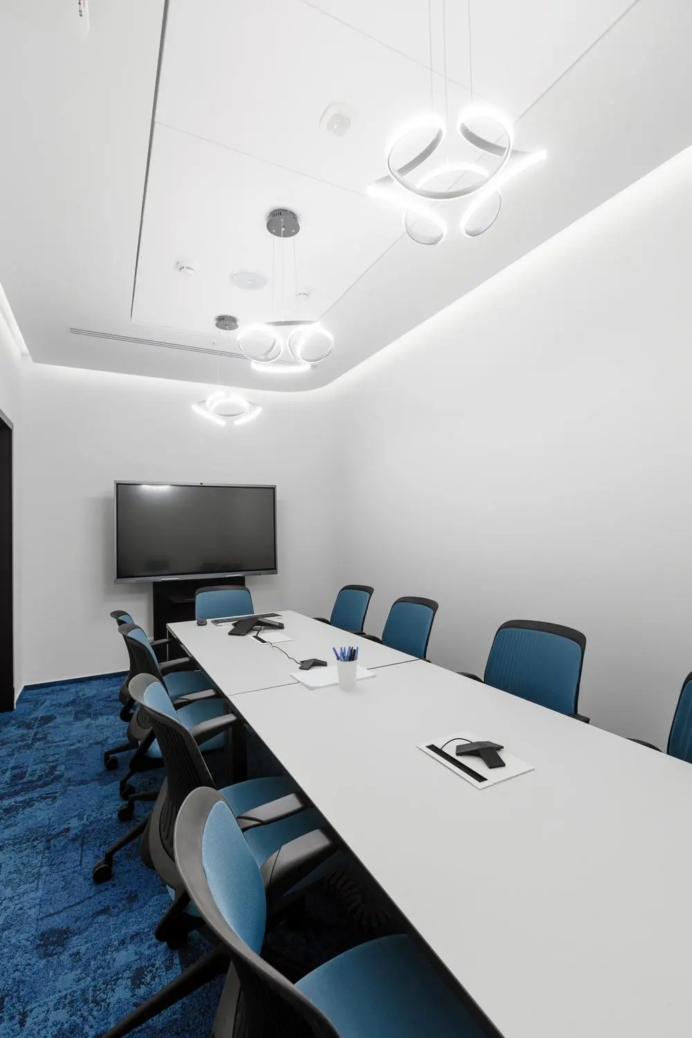 接待区的设计未来感十足。接待台前后两侧的墙面采用了金属材质的面板装饰,与天花自成一体;接待台的造型如同一列正在飞速穿越隧道的高速列车,一侧墙面上的拱形开口形似隧道的入口,具有高反射系数的可耐丽人造石创造出一种火车行驶而过的错觉。穿过“隧道”后会进入一个多功能大厅,包含一个带有模块化沙发的开放协作区以及一个露天剧场,剧场主要用于举办讲座和演讲等公共类活动。“都市感”是设计师想要在这一区域呈现的空间风格,这一点,从墙面上绘制的莫斯科与圣彼得堡城市景色图形中可以一目了然地发现。