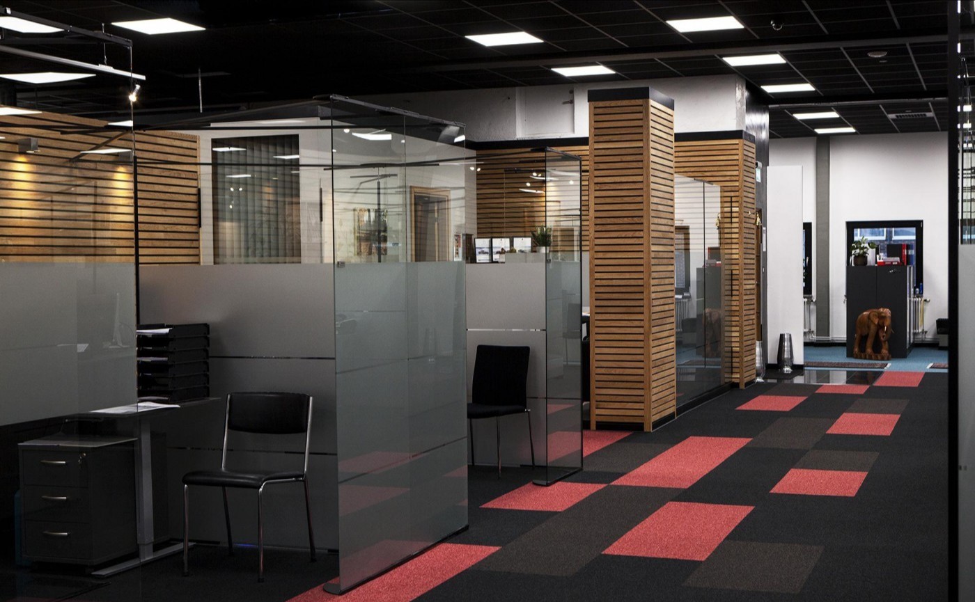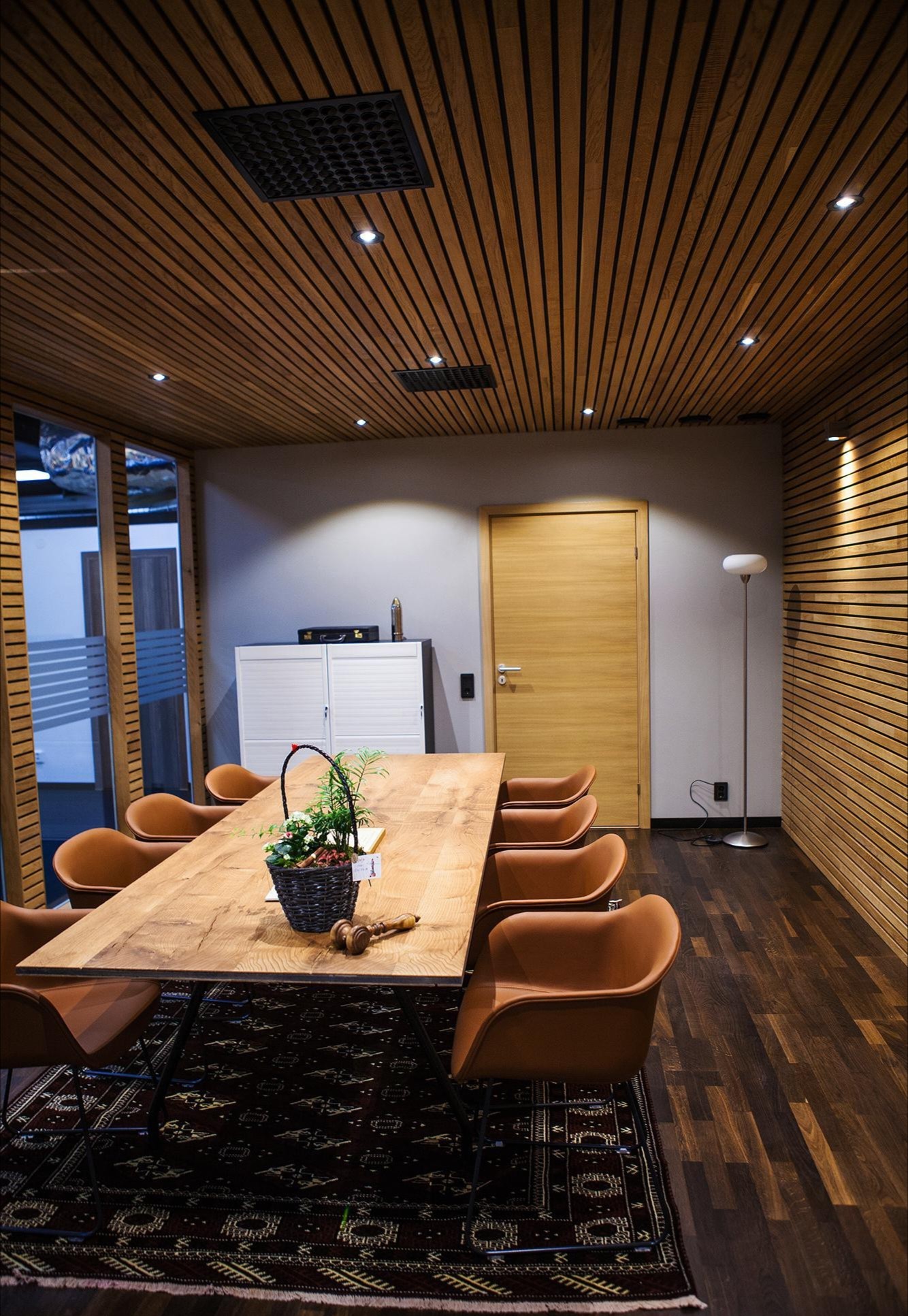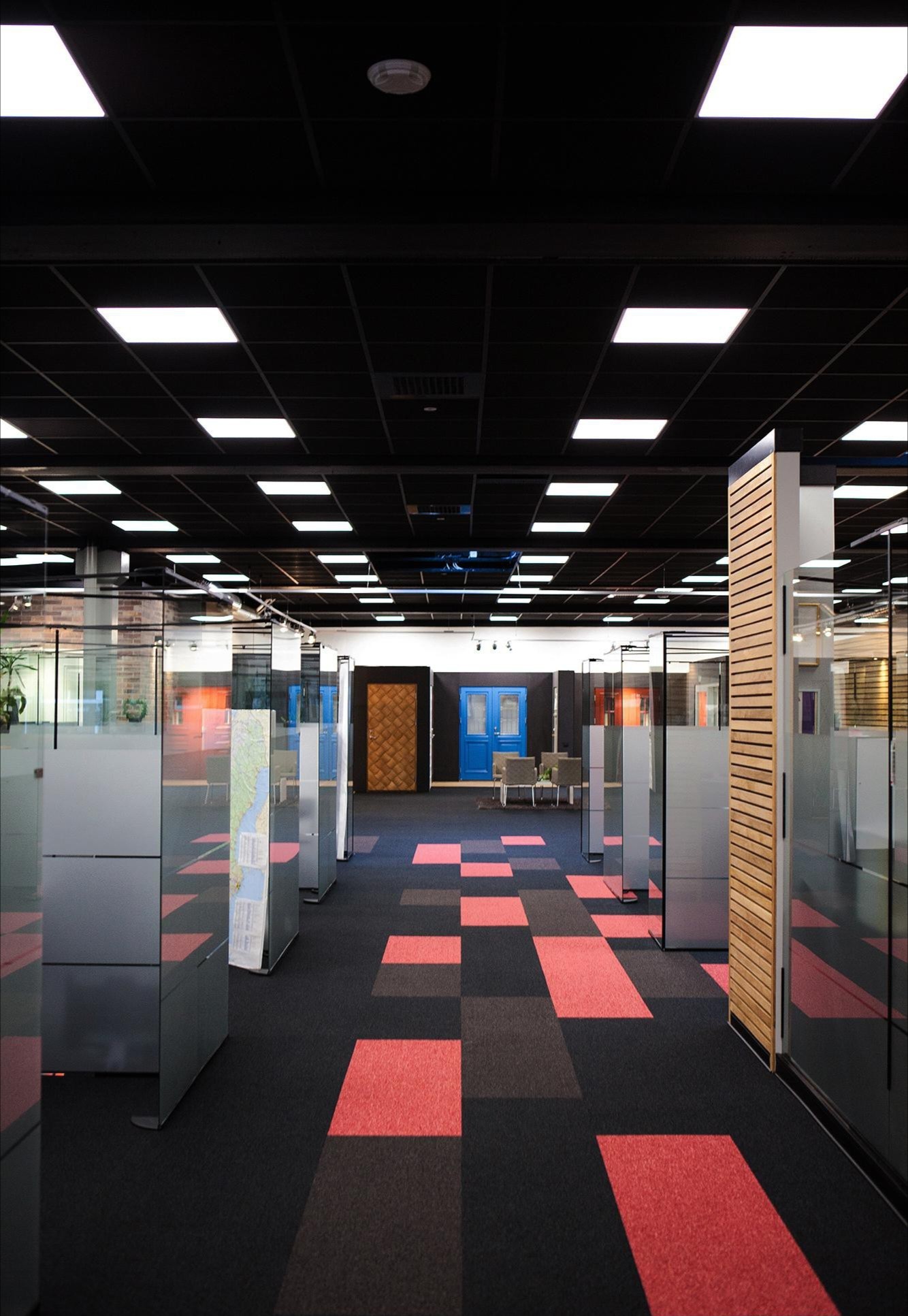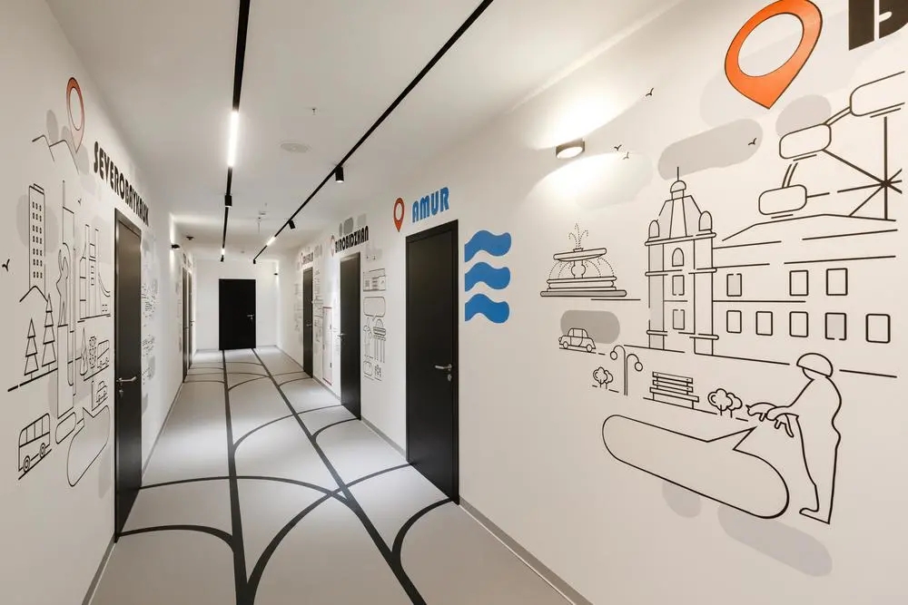 办公室平面的划分与西伯利亚铁路的地图相呼应,不同的功能区都对应着铁路地图中的不同地点:接待处如同一条穿过乌拉尔山脉(Ural Mountains)的隧道,一个个工作区仿佛是铁路沿线的城市,会议室是河流,就餐区则是萨哈林岛(Sakhalin Island)。所有功能区的名称都以地图的形式绘制在空间的墙面或地面上,一旦进入办公室,员工和访客都可以沿着生动的地图找到目的地。