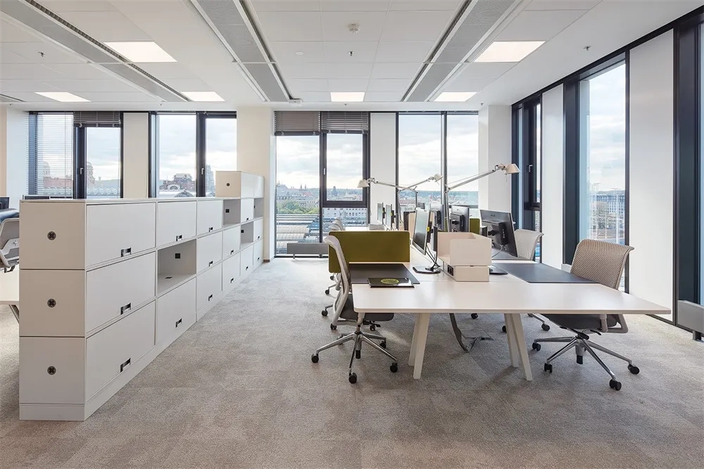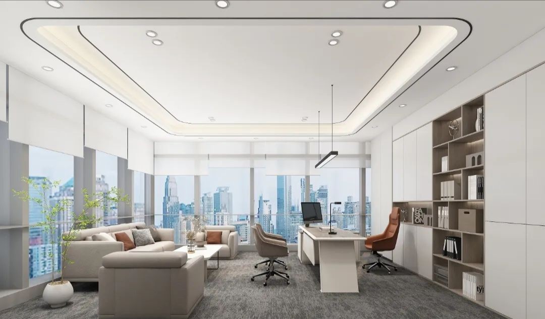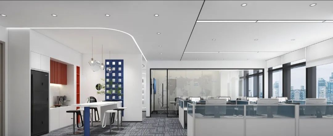 为了打造空间通透大气的效果,设计师选择用白色作为空间主色调,将白色天花墙体、灯带灯膜与少量蓝色打造的格窗、柜子组合,营造简约整齐、开放明亮的办公氛围。