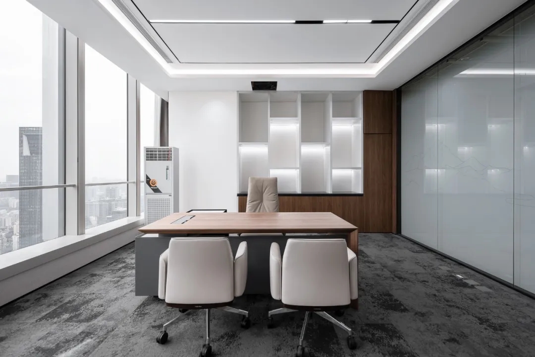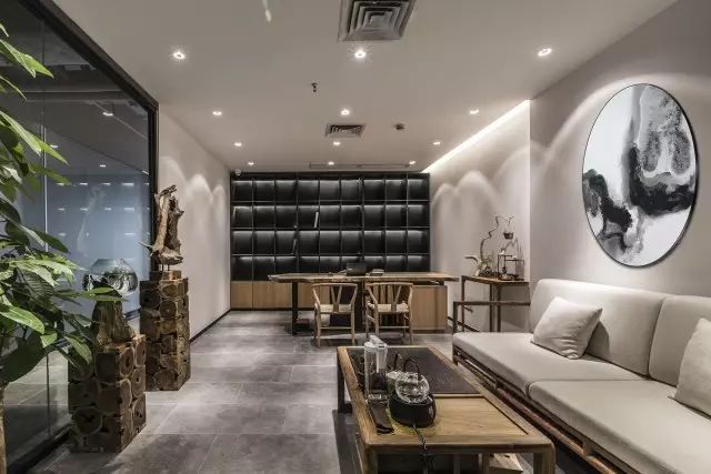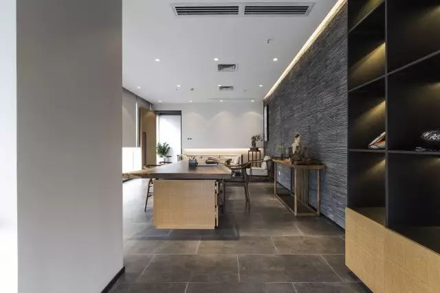 销售总监的办公室基装部分处理非常简洁,主要通过家具的陈设品凸显其空间格调。整板的原木办公台和新中式的家具相形益彰,黑铁板定制的书柜则极为现代,空间整体塑造出一种东方现代禅意的气质。