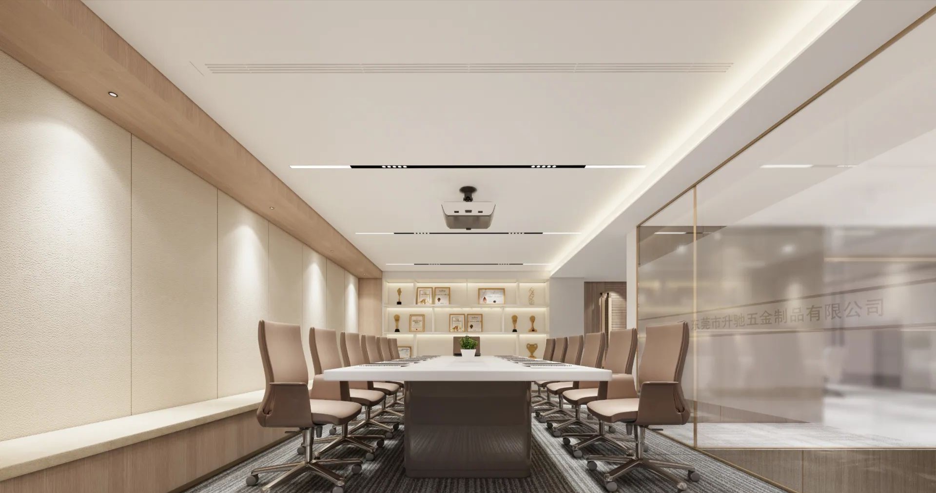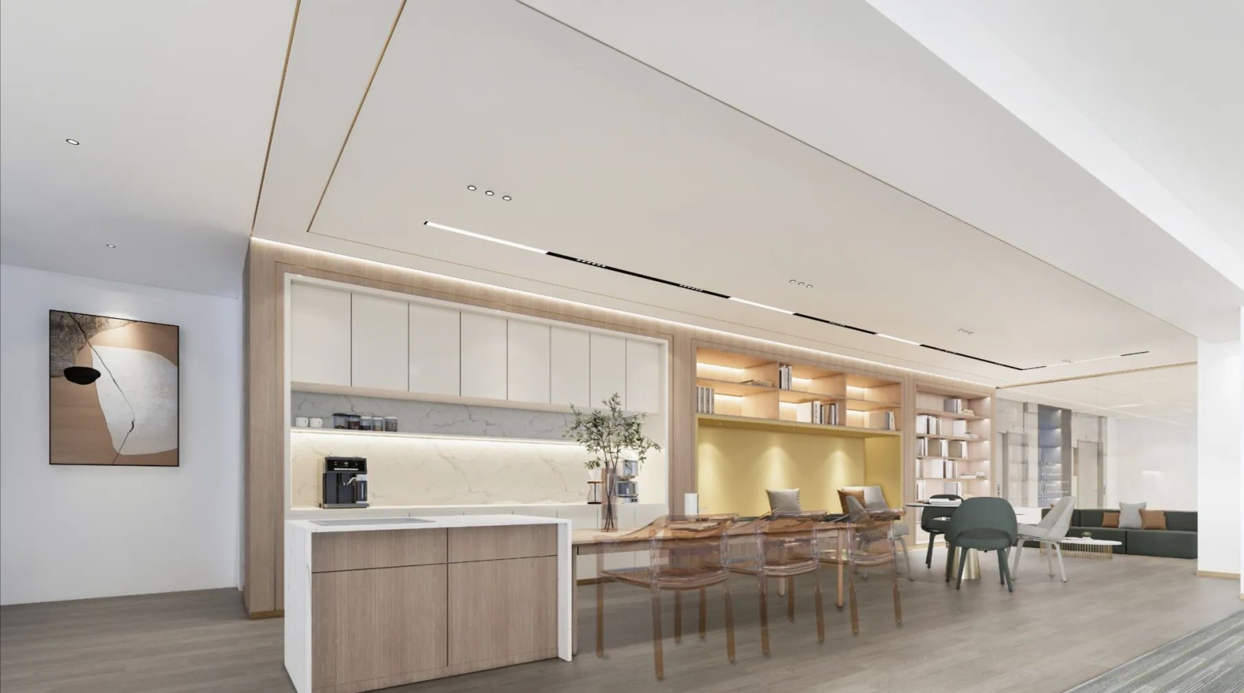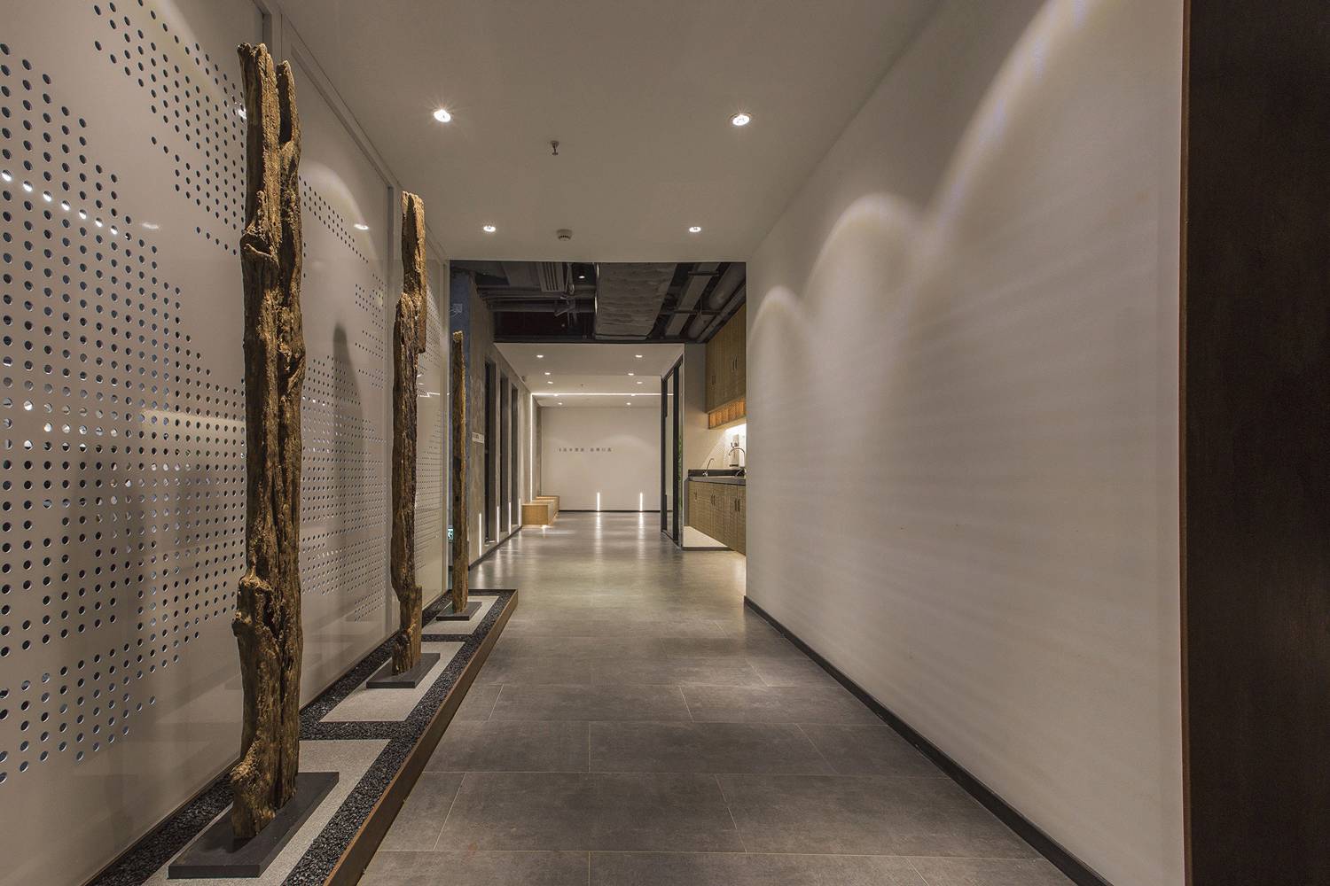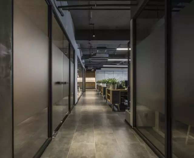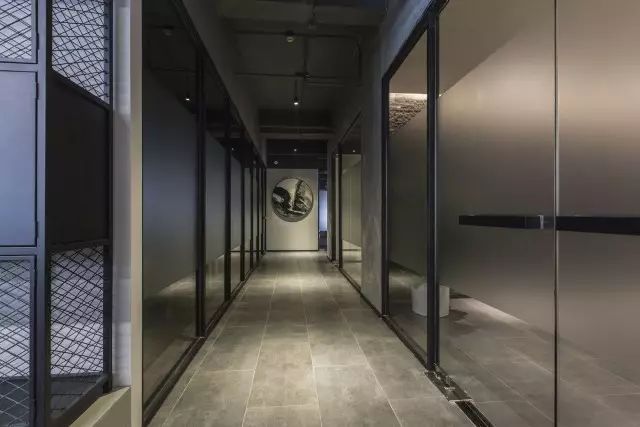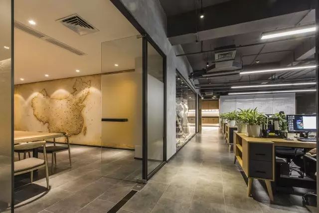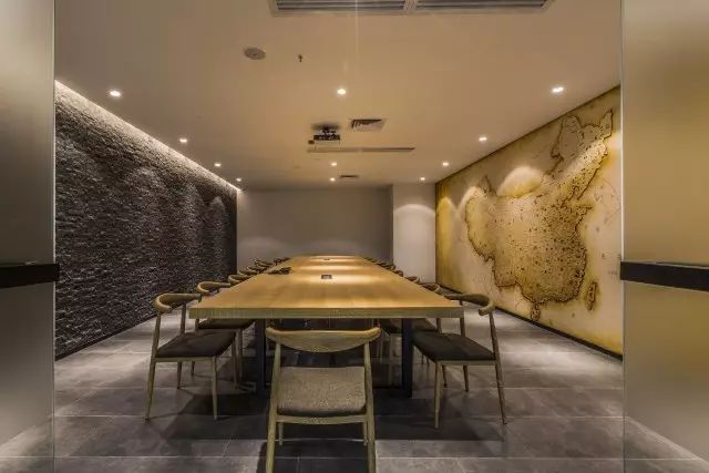 办公室中间的主通道没有刻意设计,而是在设计功能立面的时候把通道的效果直接考虑进去。通道的转角处定制了一幅水墨写意山水使狭长的通道有了聚焦点。