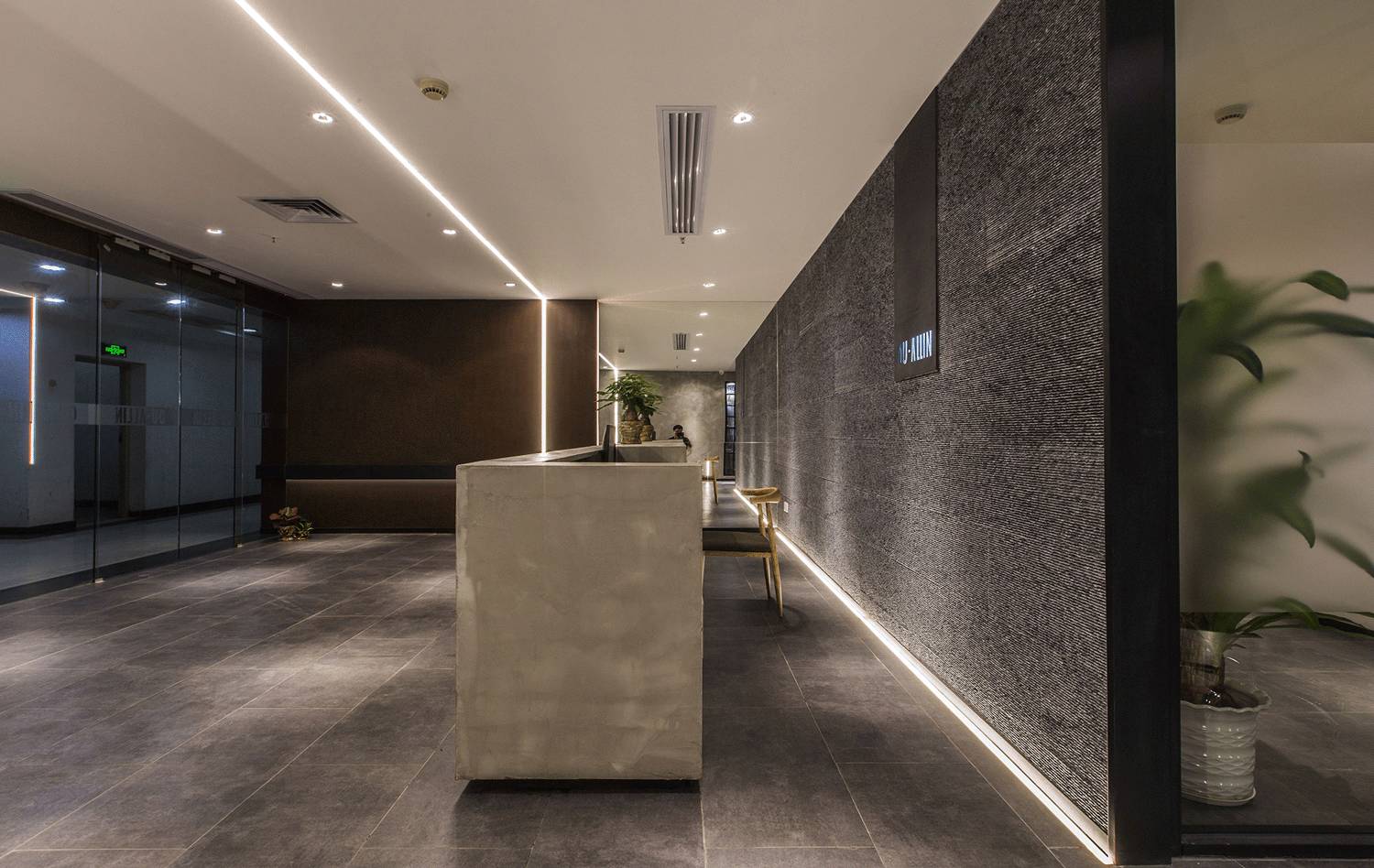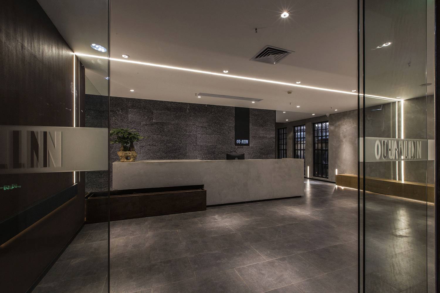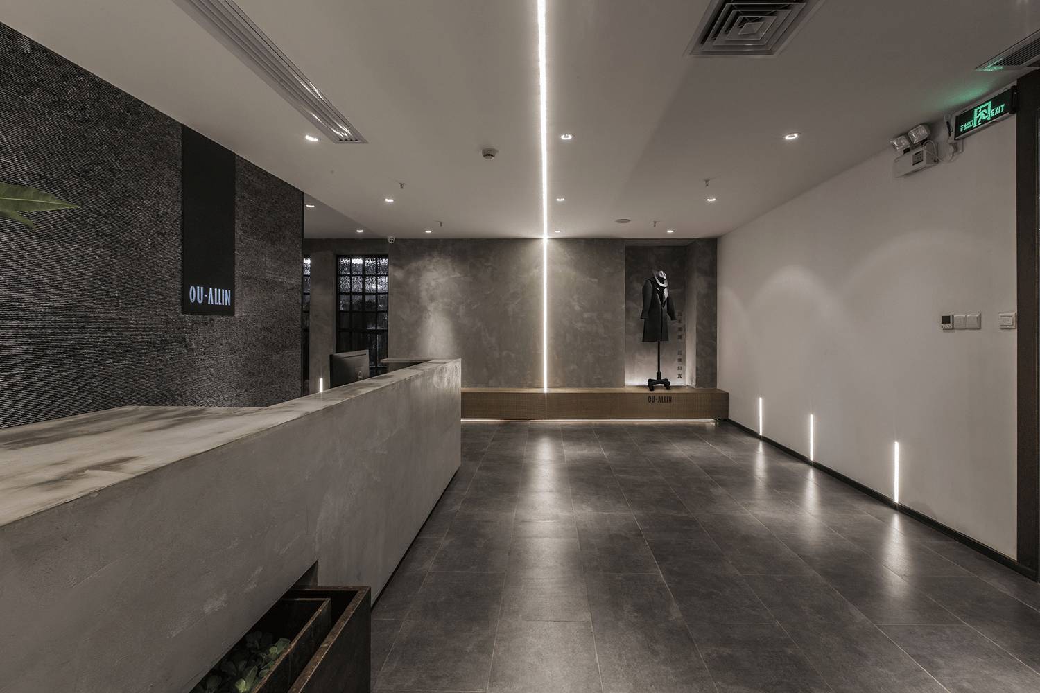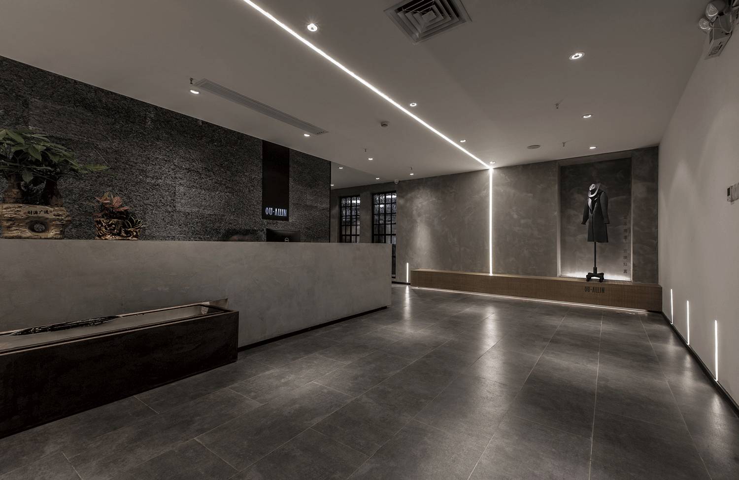 入口的设计没有多余的元素,利用形体的自身逻辑和材质光影的质感塑造时尚现代的感觉。我们把光带作为一种几何设计语言整合到空间中,塑造另一种质感。
