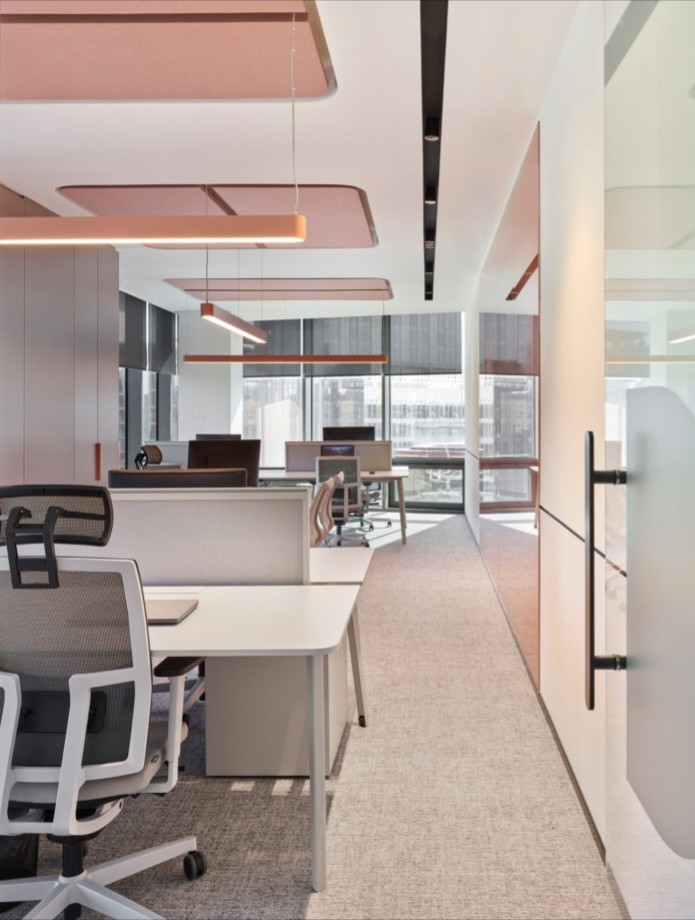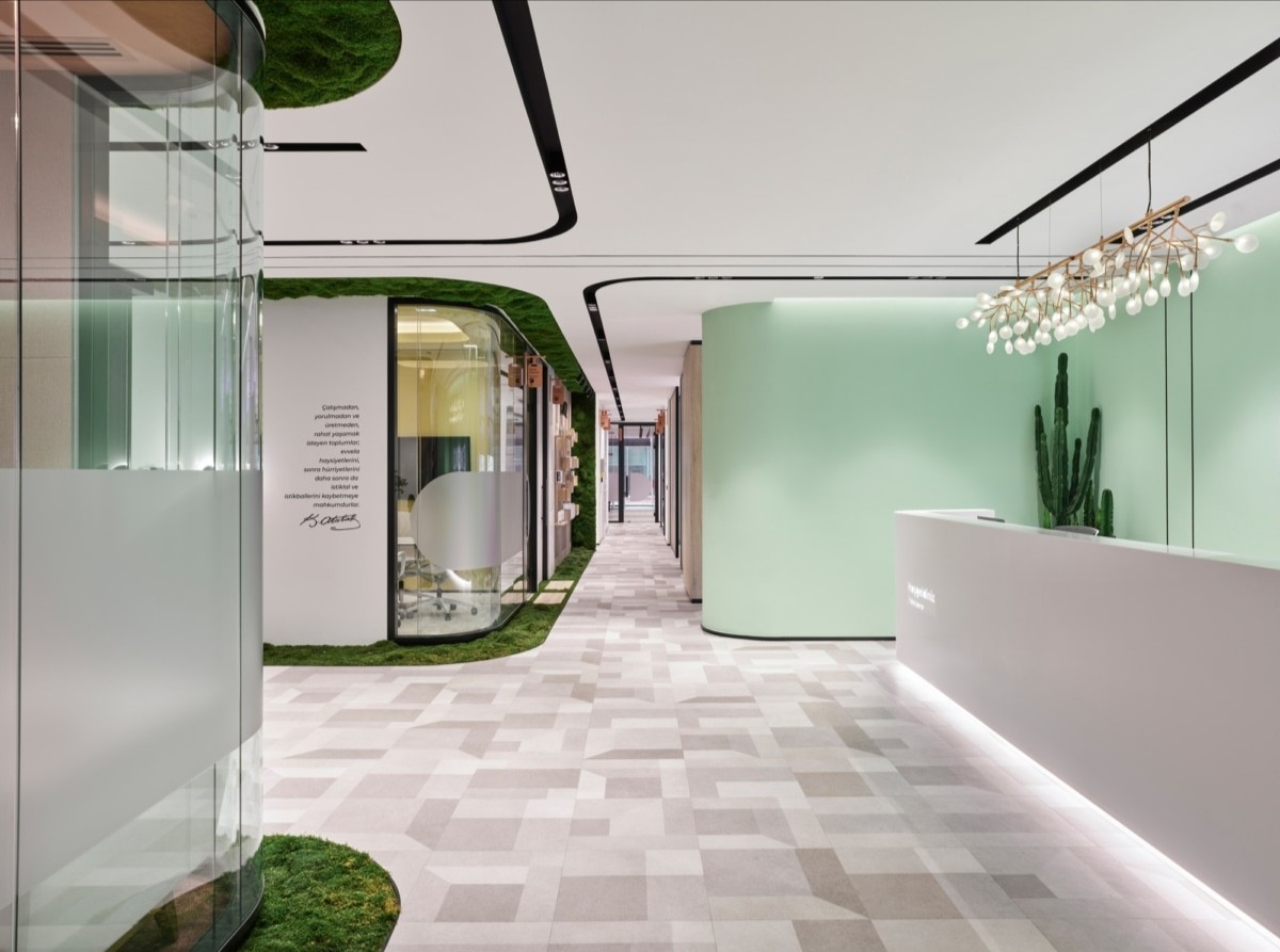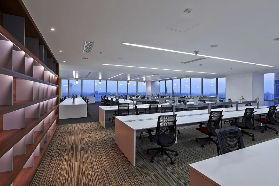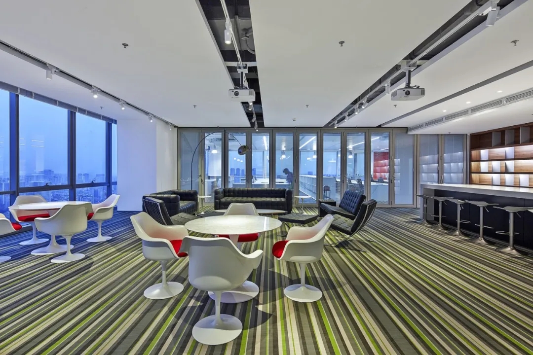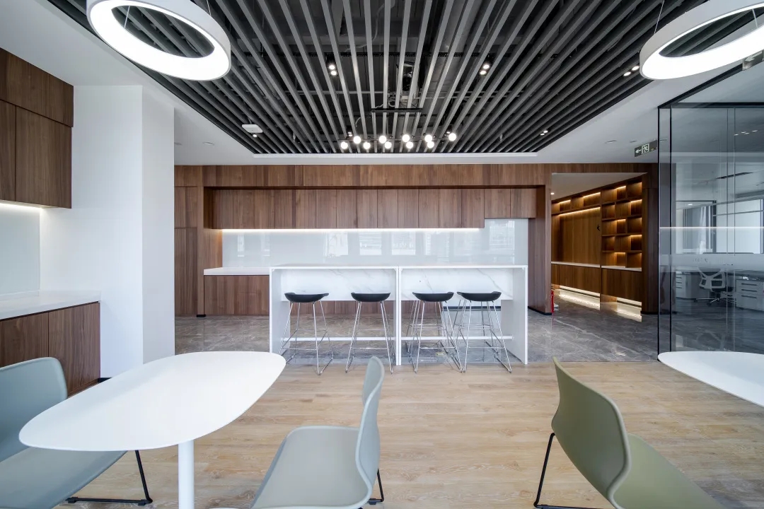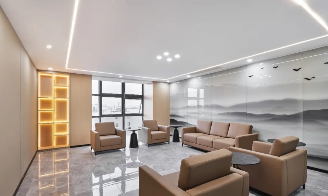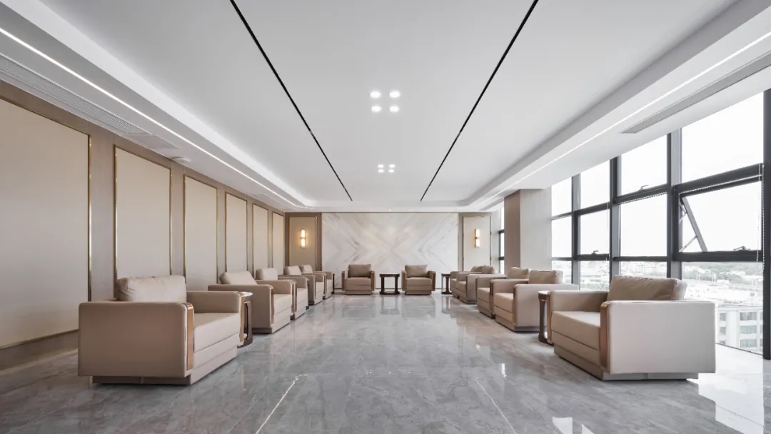 访客从中心电梯厅进入宽敞的接待大厅,一个现代、严谨、沉稳高端的商务前厅印象眼帘。接待大厅之后为独立的超大大堂吧。该区域集合洽谈丶茶水丶休闲等多种功能。改变传统办公模式,接待会客如同在一个高档咖啡厅内轻松完成。每一个客户都能享受VIP的待遇,同时这里也是整个工作场所的中心,也是大家协作、社交和互动的核心地带。