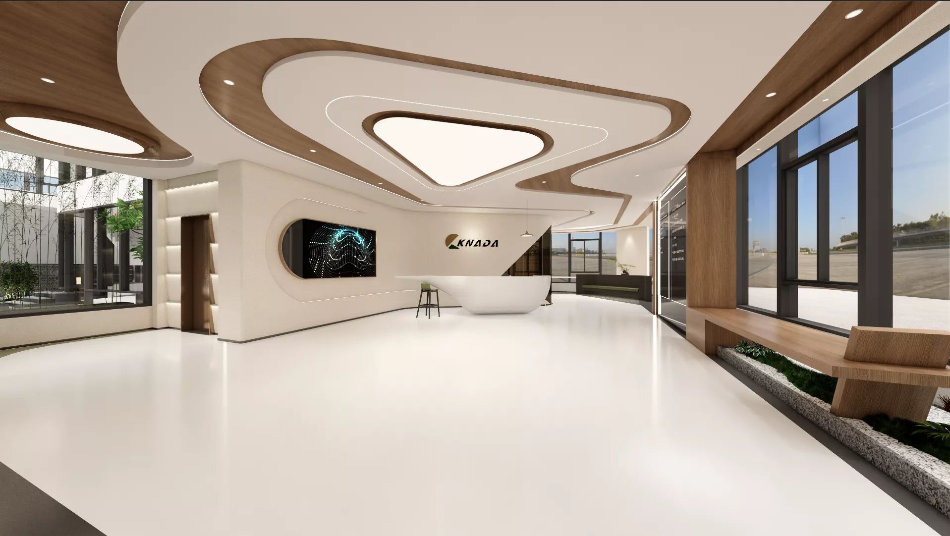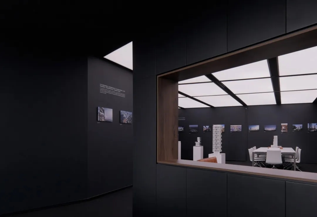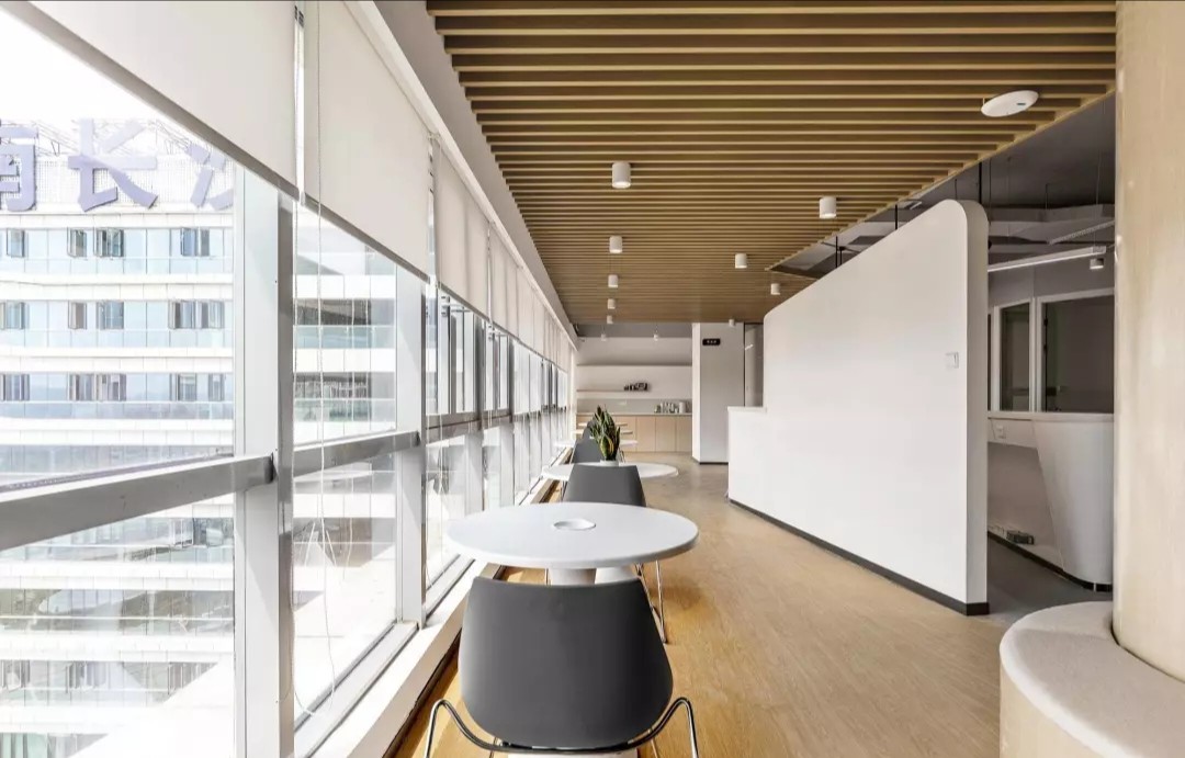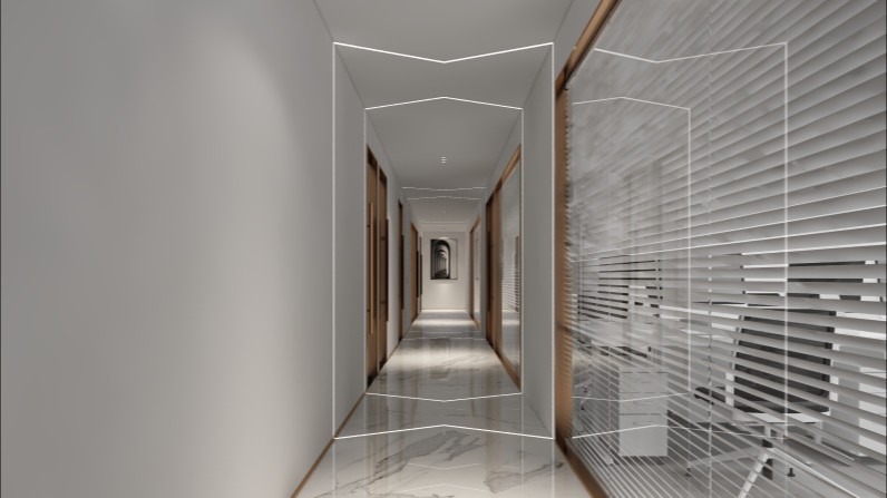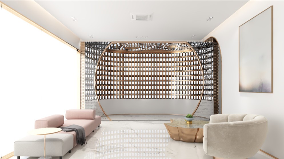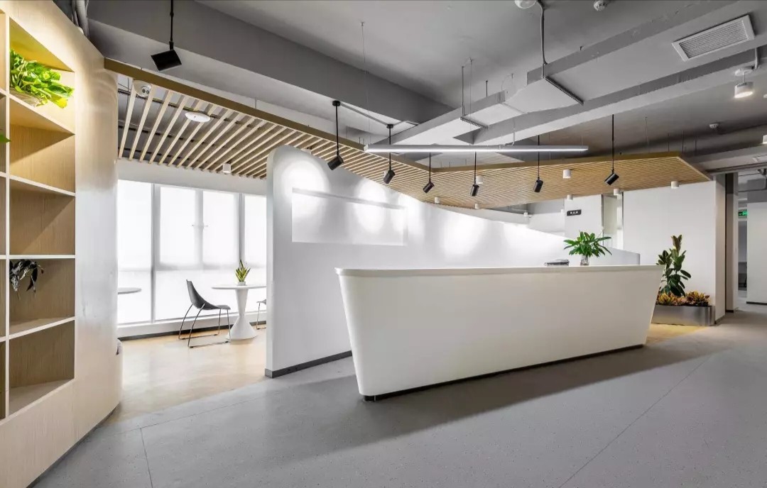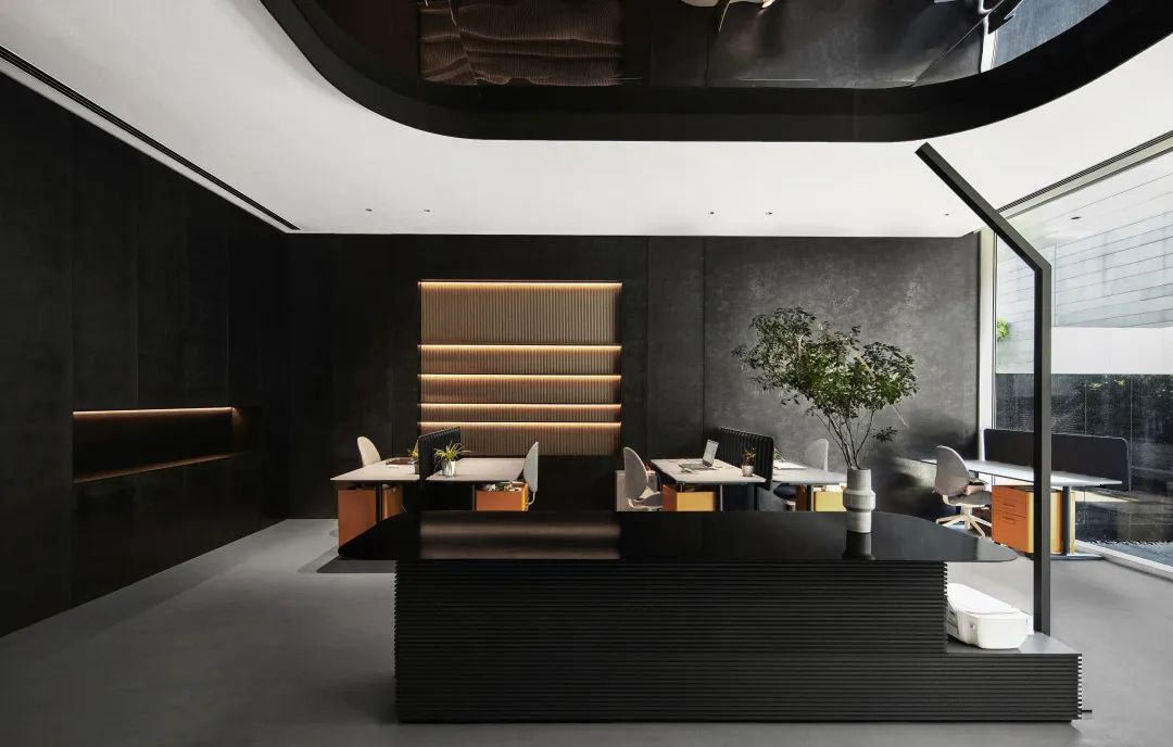 入口大厅体现一种灵活多变的时尚现代的气息,形成一种隔而不断的开放式共享空间。入口处虚实对比的隔断更能凸显企业既沉稳又包容的企业姿态。