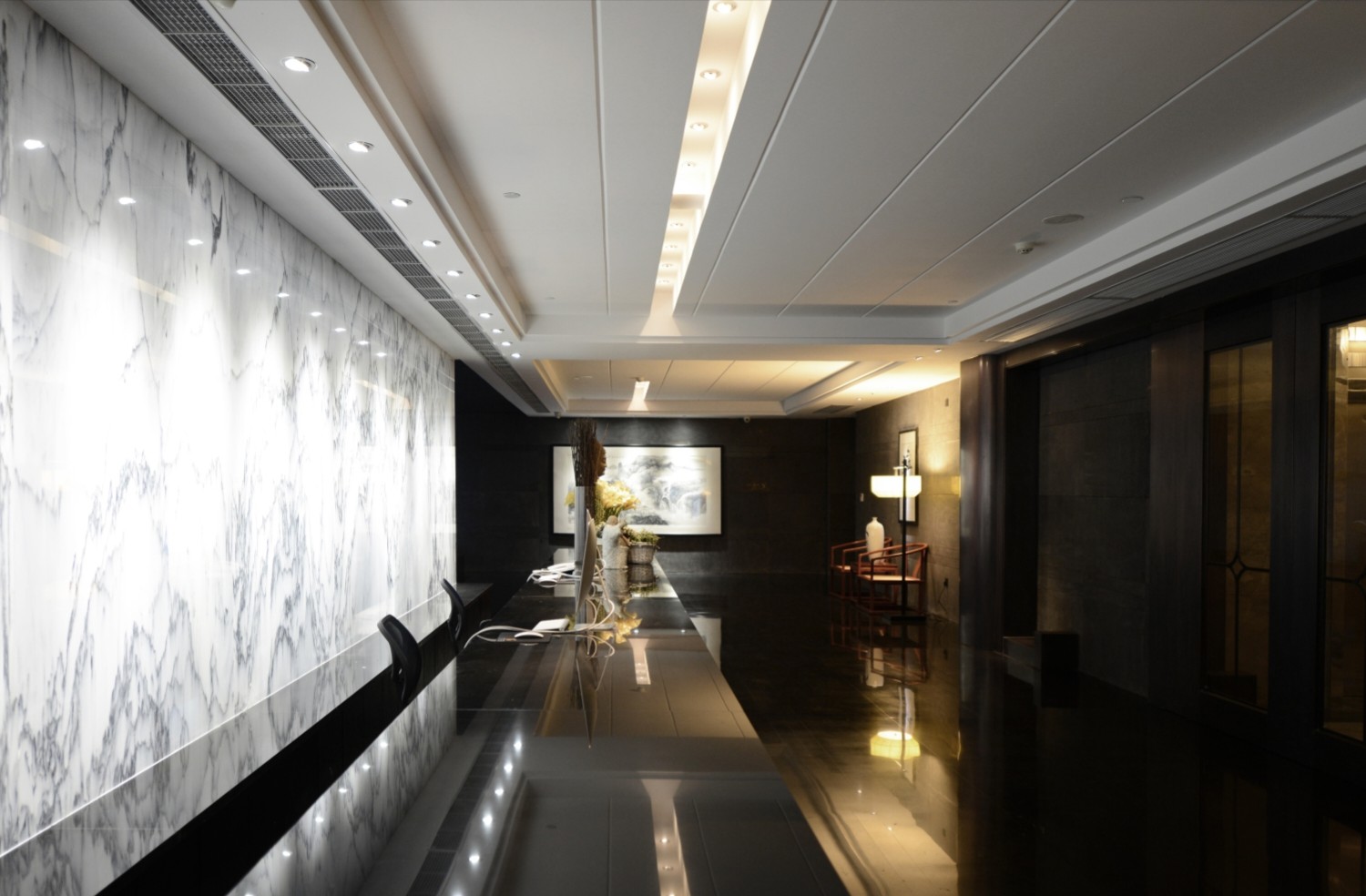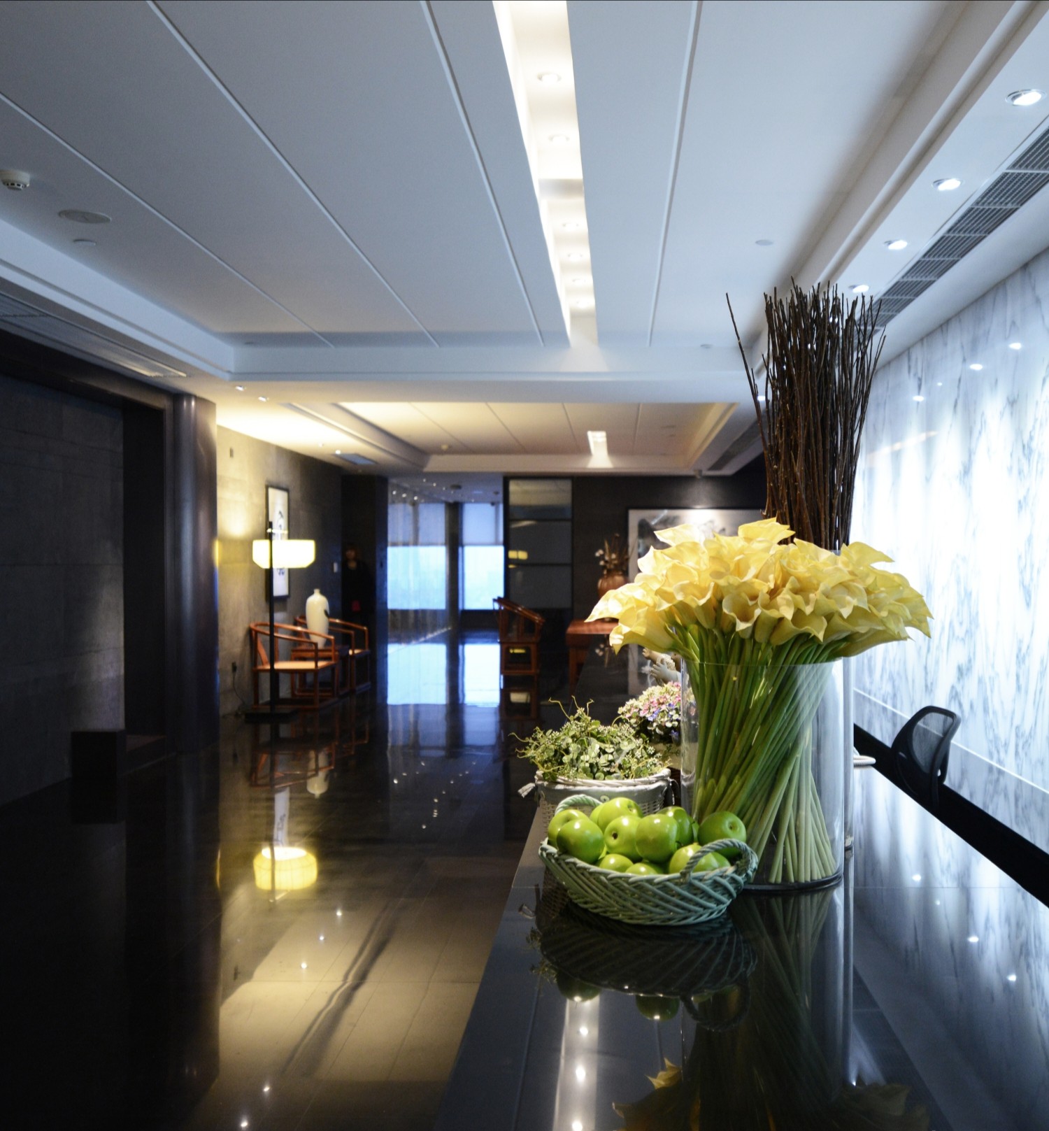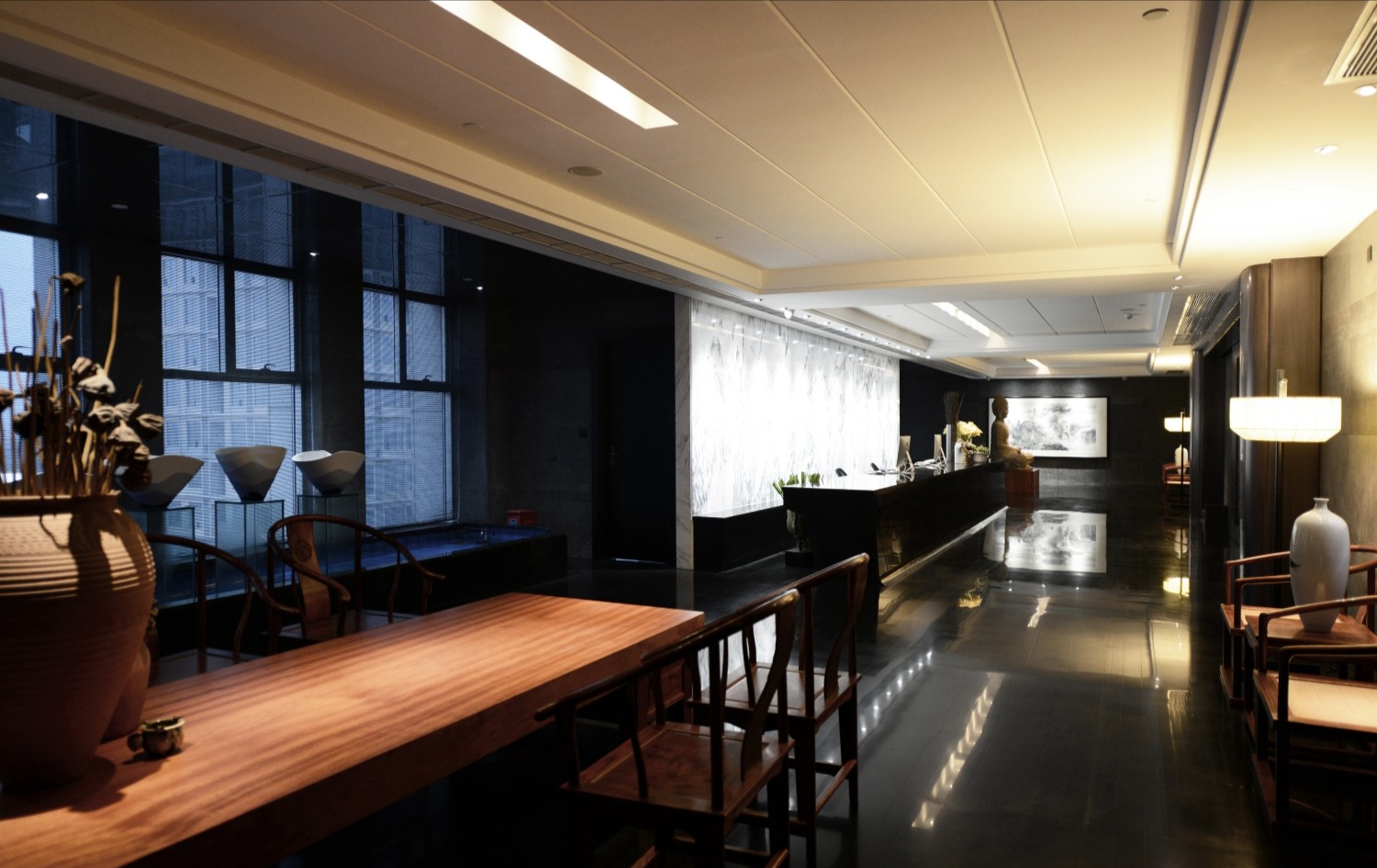 本案设计师信守均衡对称的原则来规划室内的布局,使整个动向流畅明快,充分利用了各个空间,让空间之间更为合理;整个办公室以现代手法与设计师所理解的中式传统文化内涵及中式元素的相融合使整体庄重,淡雅。大厅的前台背景是特地在石材产地挑选的,它如墨如画淡雅出尘,妙在似与不似之间再配以侧边的水景以及内敛、质朴的中式家具,让人觉得别有一番韵味,使人产生丰富的遐想无形中透露出中国式的意境之美。