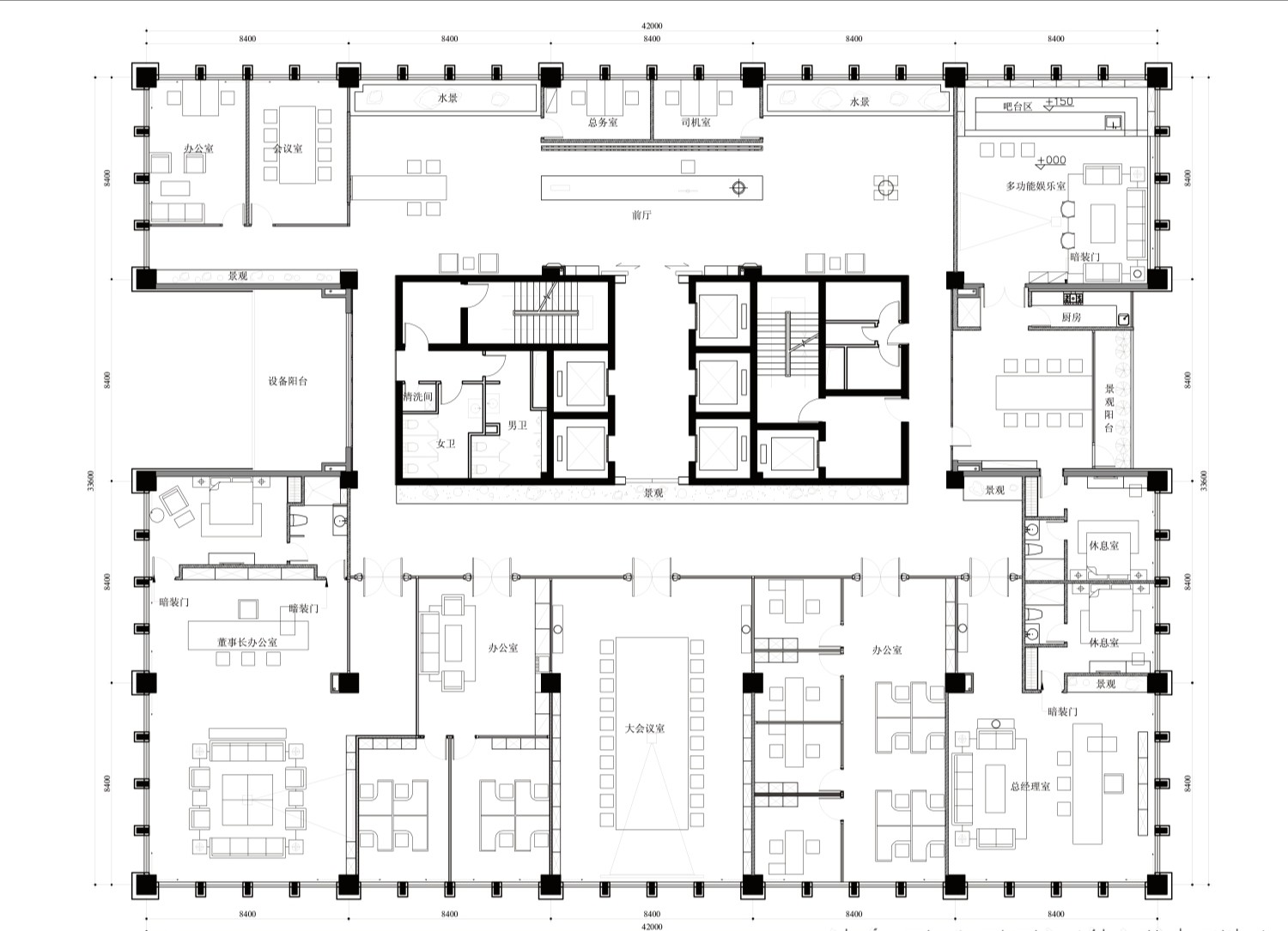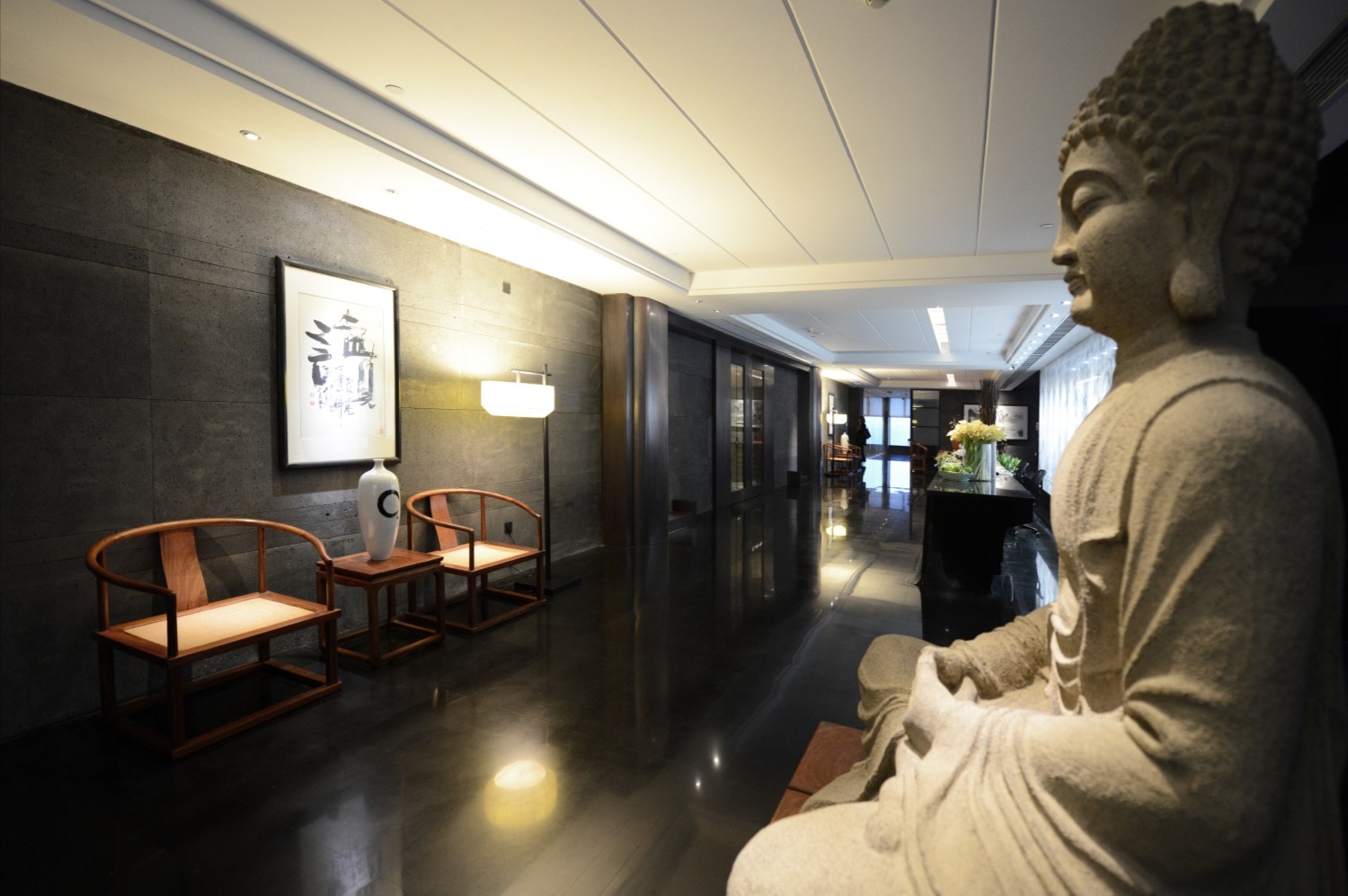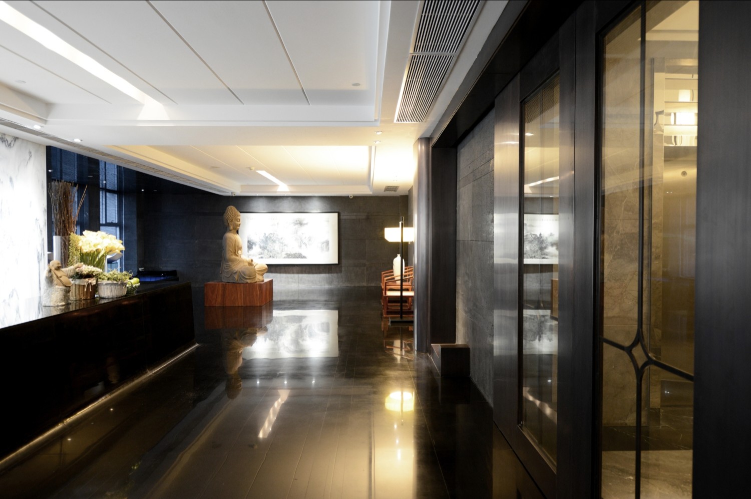 本案设计师信守均衡对称的原则来规划室内的布局,使整个动向流畅明快,充分利用了各个空间,让空间之间更为合理;整个办公室以现代手法与设计师所理解的中式传统文化内涵及中式元素的相融合使整体庄重,淡雅。大厅的前台背景是特地在石材产地挑选的,它如墨如画淡雅出尘,妙在似与不似之间再配以侧边的水景以及内敛、质朴的中式家具,让人觉得别有一番韵味,使人产生丰富的遐想无形中透露出中国式的意境之美。