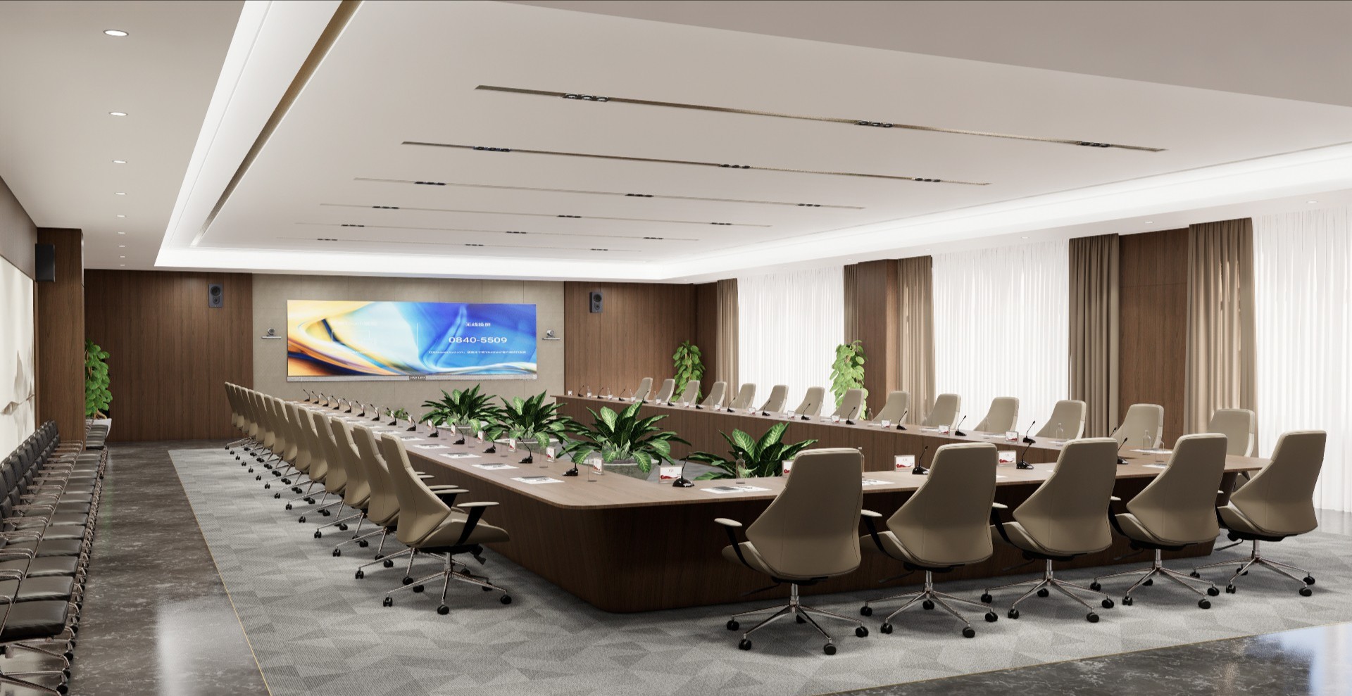 会议室为蓝色,并有一个模仿水层的蓝色波浪形吸音天花板。由于超高的混凝土天花板,我们能够用黑色油漆“消失”基础设施,使空间看起来干净、优雅。一个长而弯曲的灯具伴随着空间中的运动。