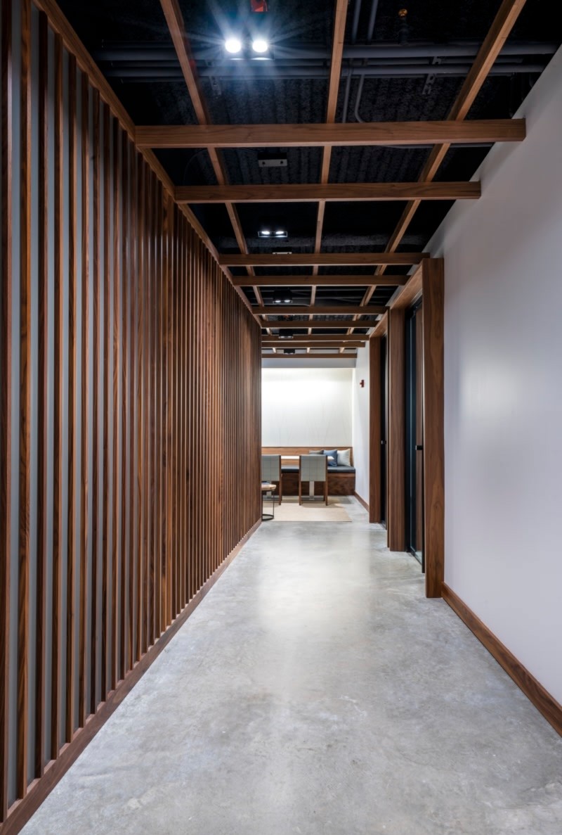 为了视野更加的开阔,办公室规划了从入口处看到房间中央元素两侧的玻璃墙。每个区域的玻璃墙都允许自然光照射到空间的其他部分。波纹木饰面覆盖了中心元素,模拟了海洋的分层和活力。