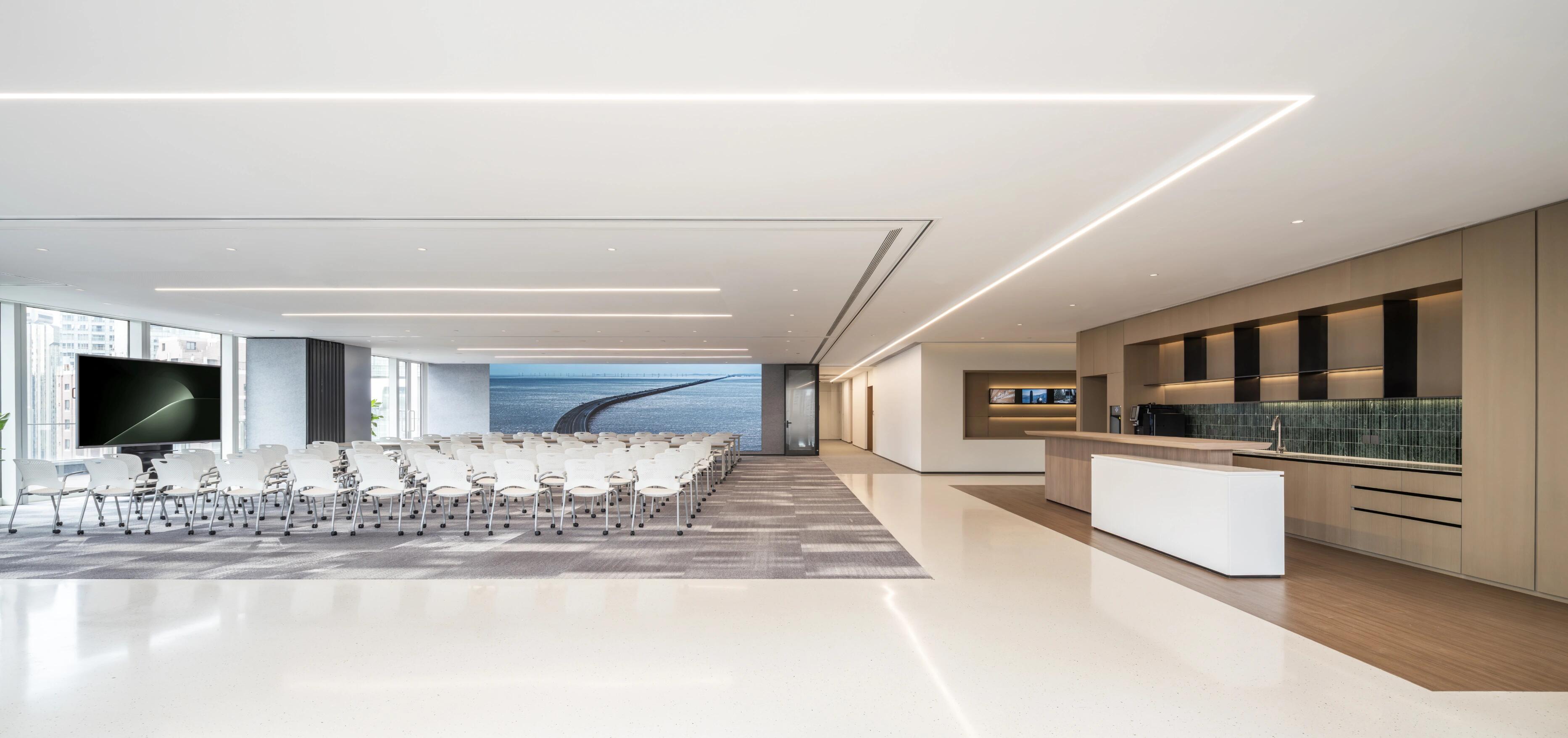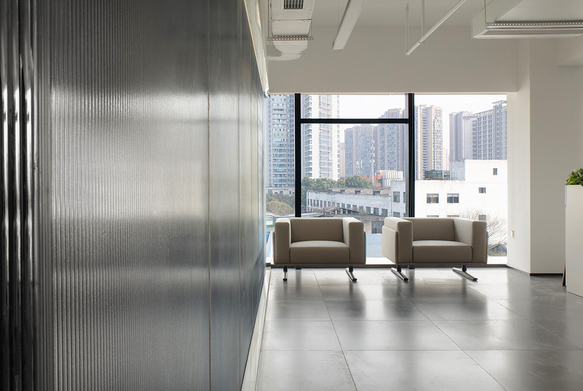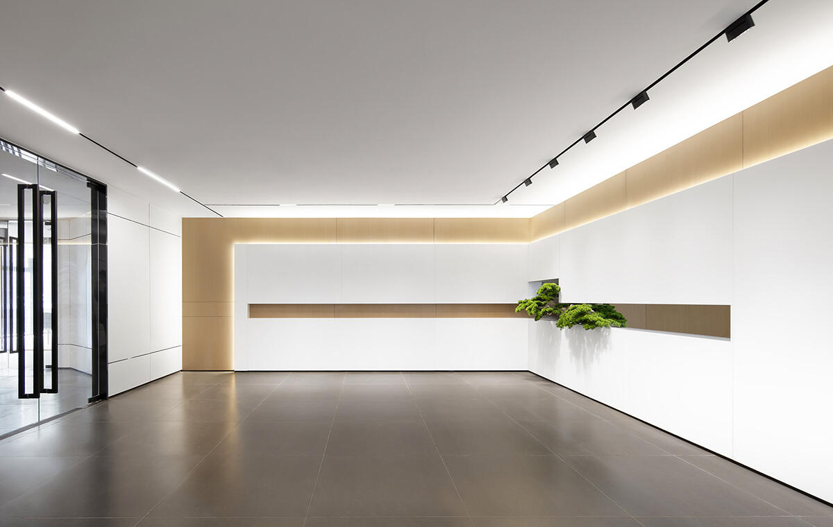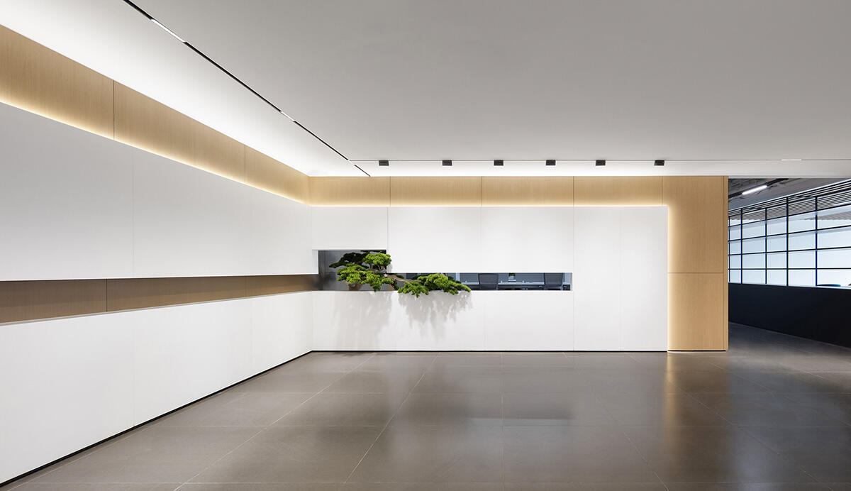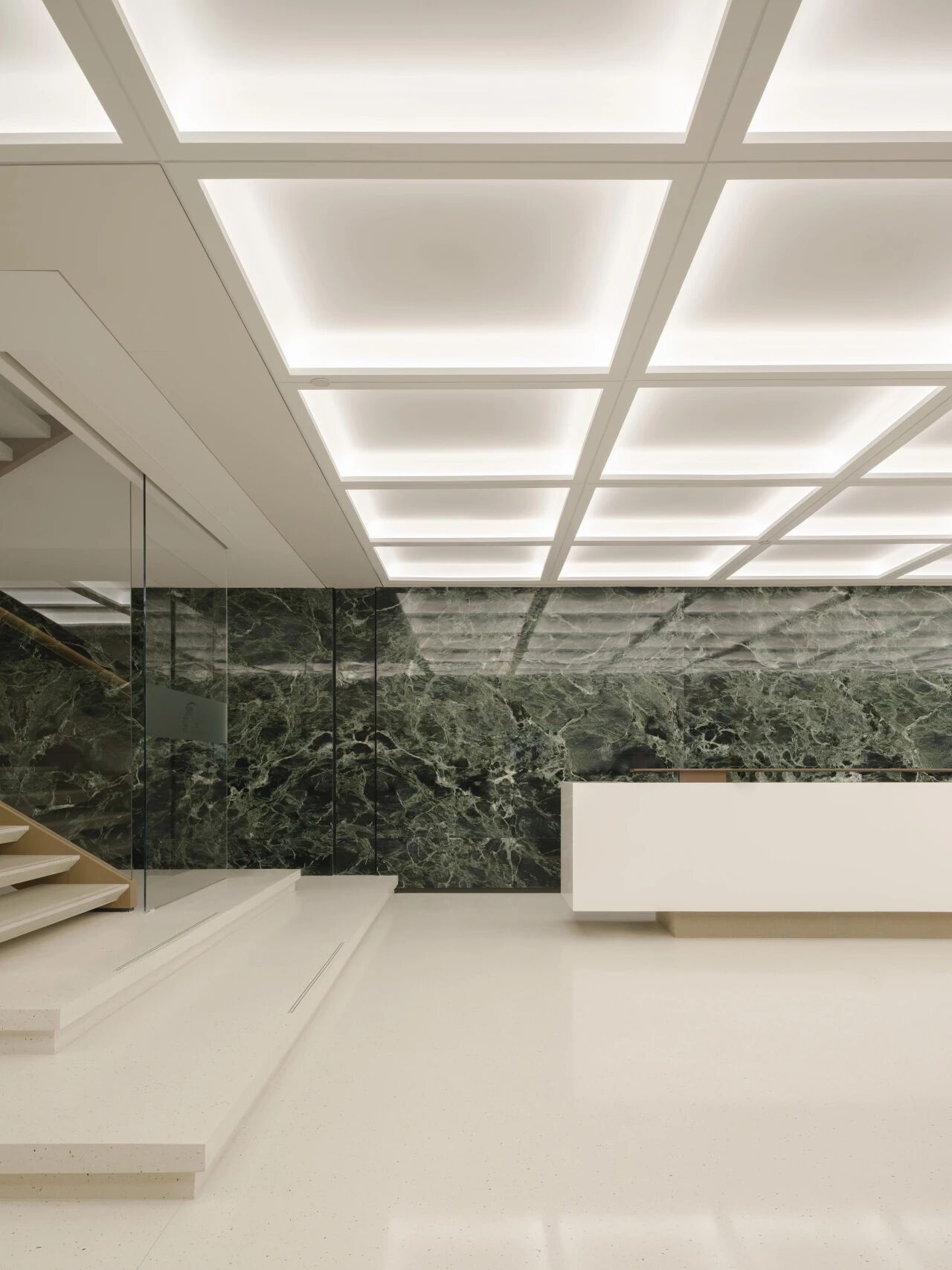 项目设计灵感来自“权衡”。权衡取其平,平者乃公道之谓也。称重量的器物,名曰衡器,衡为杆,权为砣。黑色条形石材台如秤杆横跨接待区,连接Logo墙。前台绿大理石象征石权。石权,俗称秤砣,是古代讼师追求法治公正的标志。方格天花造型,漫反射灯光均匀而和谐。整体设计体现空间的正气和秩序感。