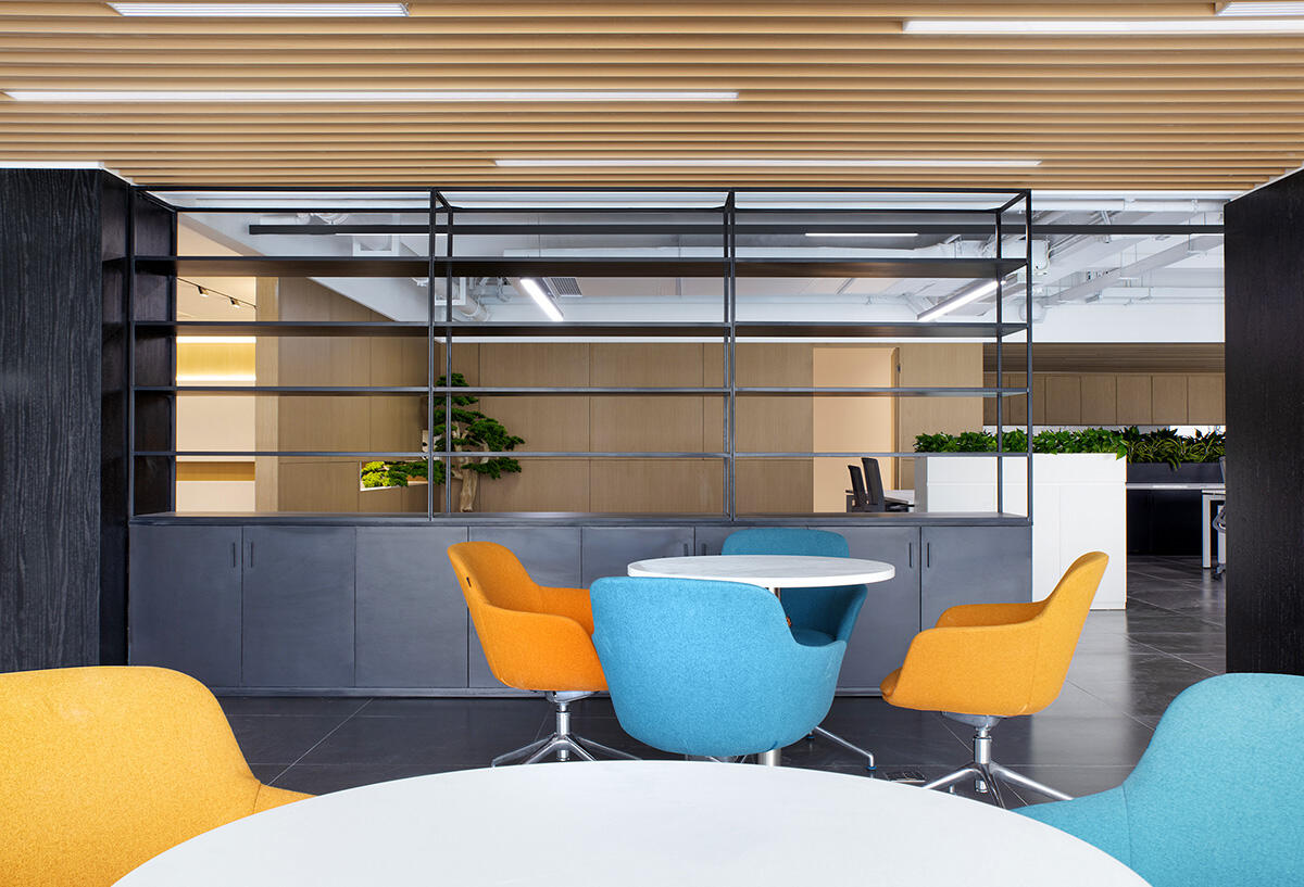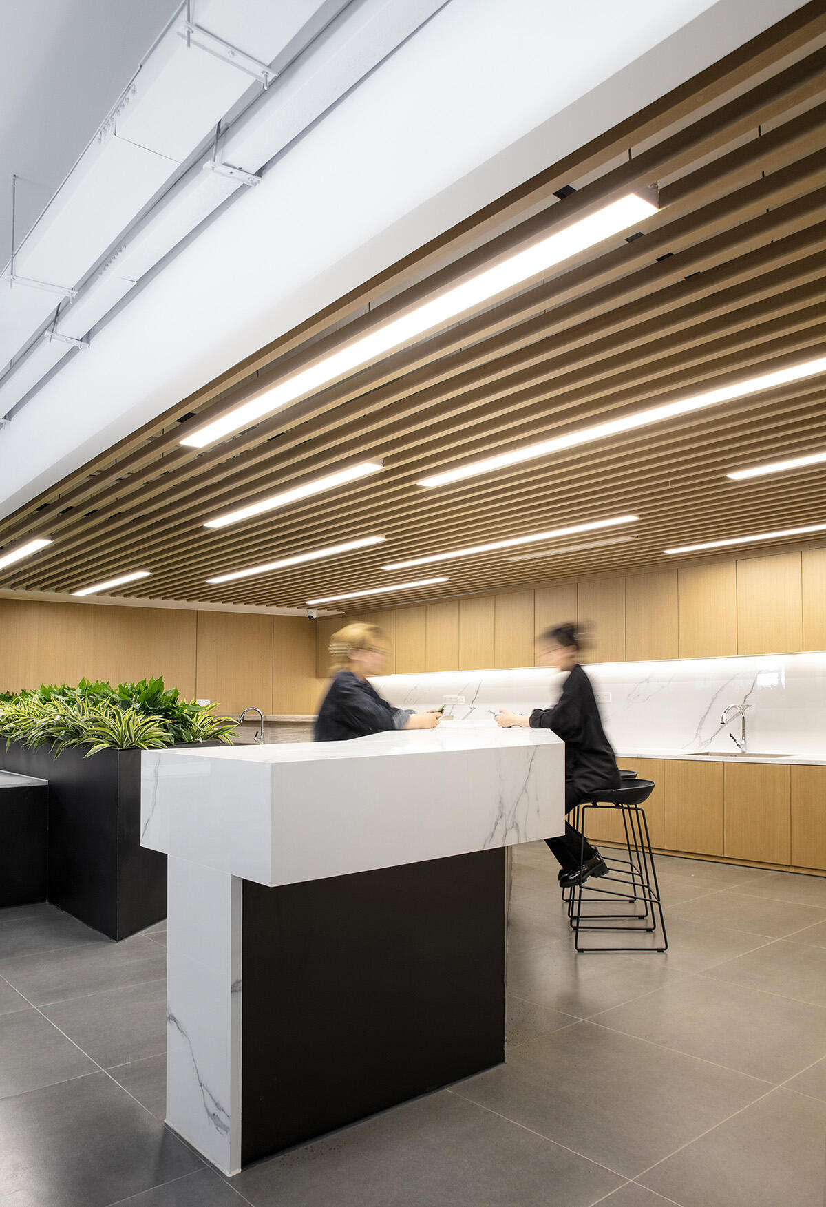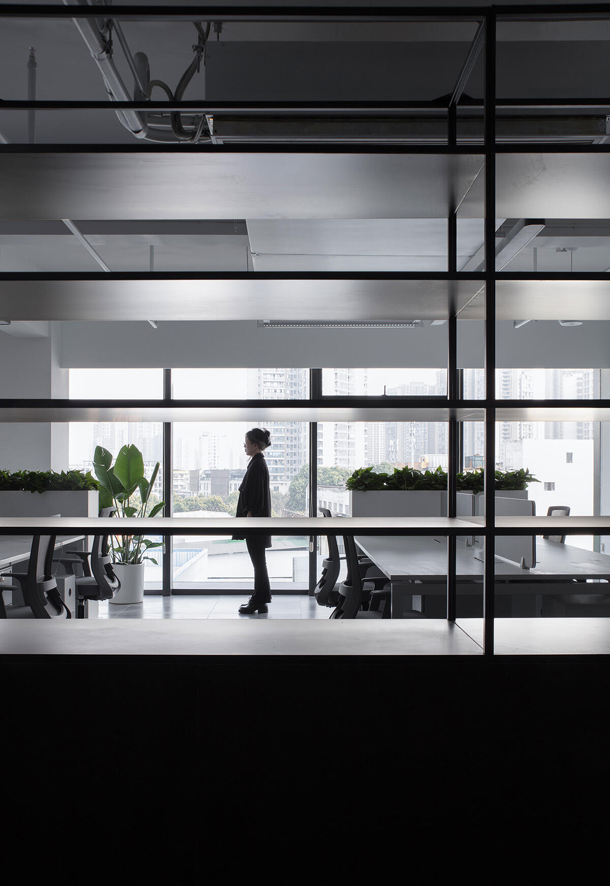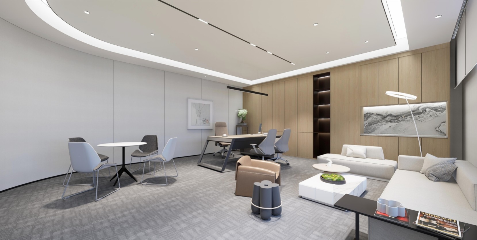 项目设计灵感来自“权衡”。权衡取其平,平者乃公道之谓也。称重量的器物,名曰衡器,衡为杆,权为砣。黑色条形石材台如秤杆横跨接待区,连接Logo墙。前台绿大理石象征石权。石权,俗称秤砣,是古代讼师追求法治公正的标志。方格天花造型,漫反射灯光均匀而和谐。整体设计体现空间的正气和秩序感。