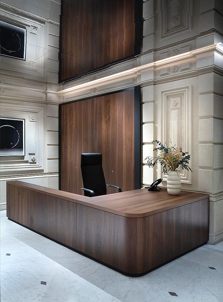 主要的设计主题,而木质模型则展示了地标建筑作为雕塑元素。丰富质感的墙砖展示了过去项目的抽象细节,体现了KPF对工艺的承诺。自然光被用来帮助直观的导航,引导访客从接待区走向温暖明亮的南方咖啡馆和休息室,会议室和画廊空间便设立在这条路线之上。