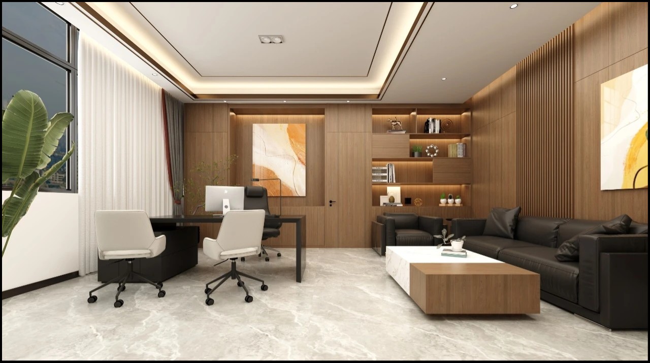 总经理办公室设计上,采用了简单舒适的设计风格,选用的简约的办公家居,通过书架和工艺品的点缀,彰显了主人专业、干练的气质。深色与浅色相辅相成,使得整个画面十分柔和。