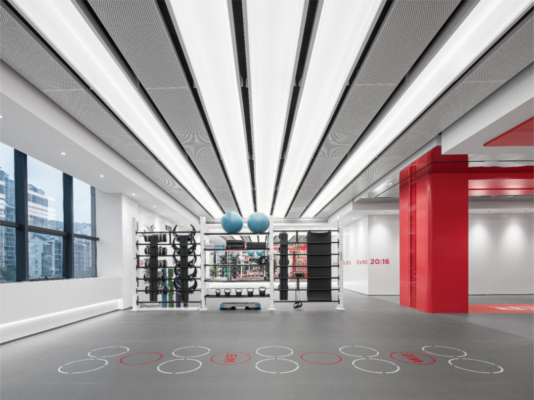 弧形房间边缘增加了公共空间的柔和度和趣味性,而黄色线条和LED灯条的嵌入为整个空间增添了动态和现代感。暗藏式的洗墙照明系统、装饰性景观元素和设计得像高尔夫球上的超大圆点的纹理天花板,强烈地刻画了两个休闲社交区域的舒适氛围。大理石材质的运用,提升了俱乐部的质感,并用于标记一些非常特殊的区域,如悬浮的接待台。长虹玻璃和透明玻璃的交错使用,增强了公共与私密空间的对话,创造了一个有趣的视角。