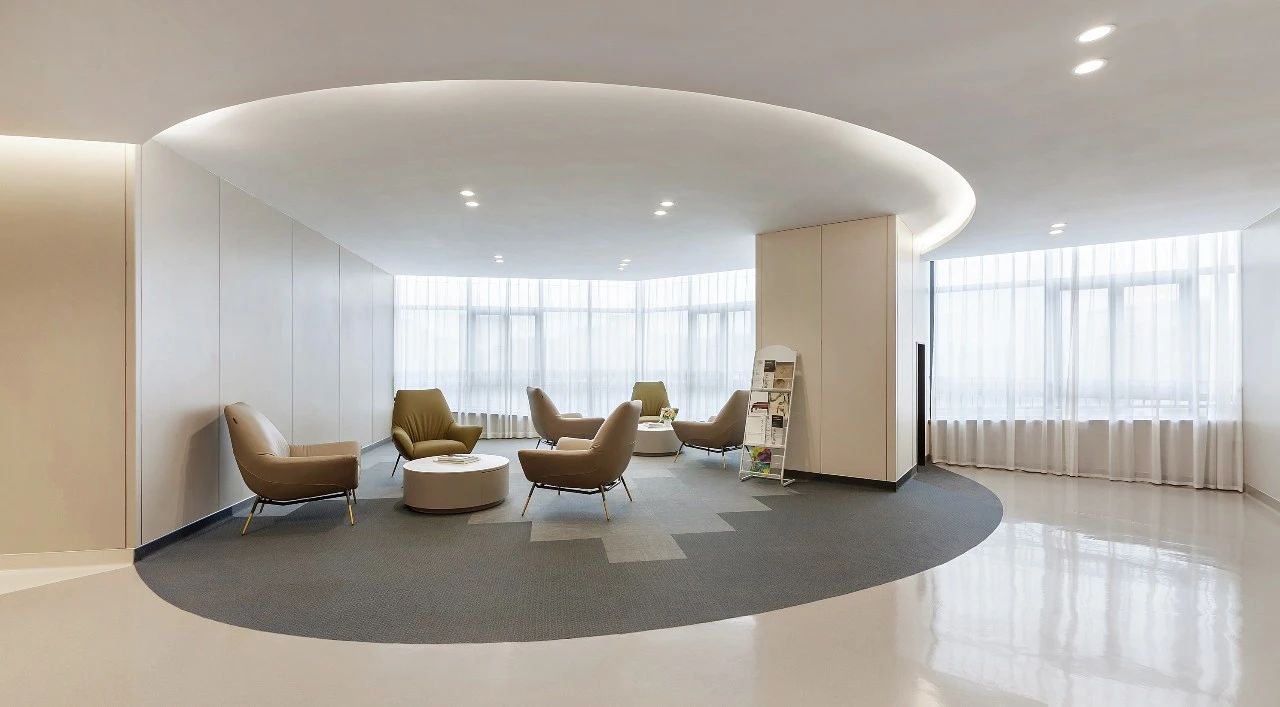 在体块穿插间将前厅解构出一个有趣的盒子,洄游式动线,打破现有秩序。接待、洽谈、收纳、水吧,自成一体,干净利落的的线条元素,呈现恰到好处的以简驭繁。