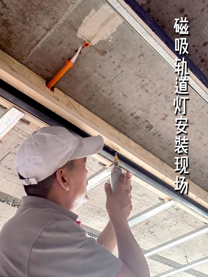 磁吸轨道灯必须在木工进场施工之前就买好放在现场,这点很重要。因为木工会根据灯底座的尺寸,现场制作木质框架,作为灯的安装基础。