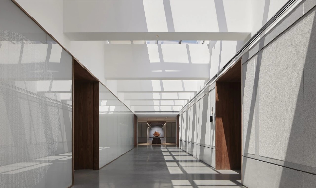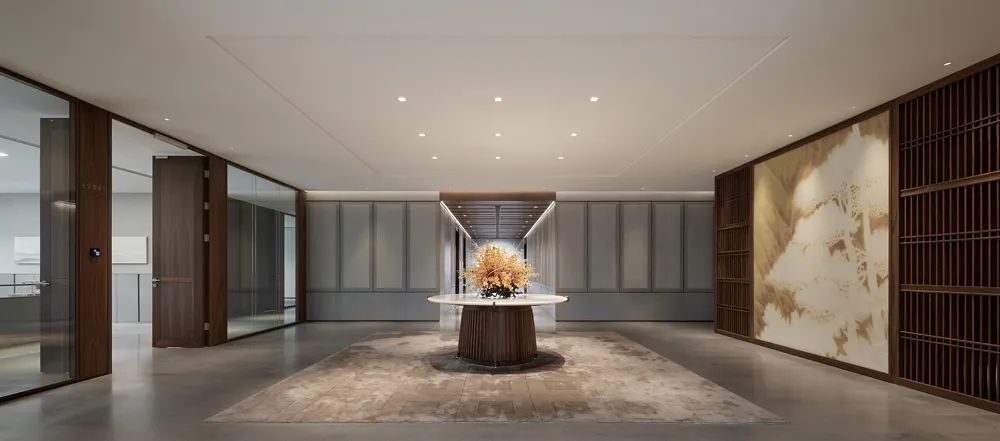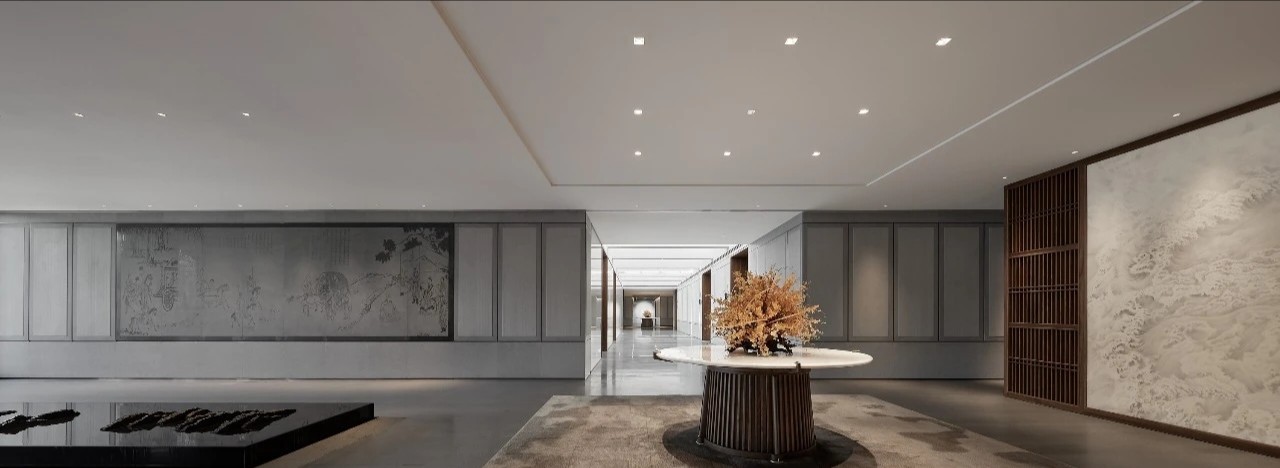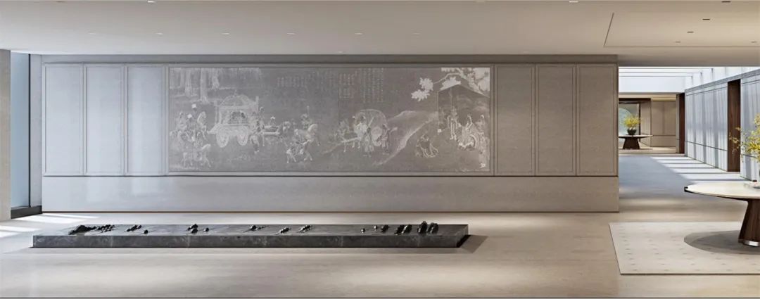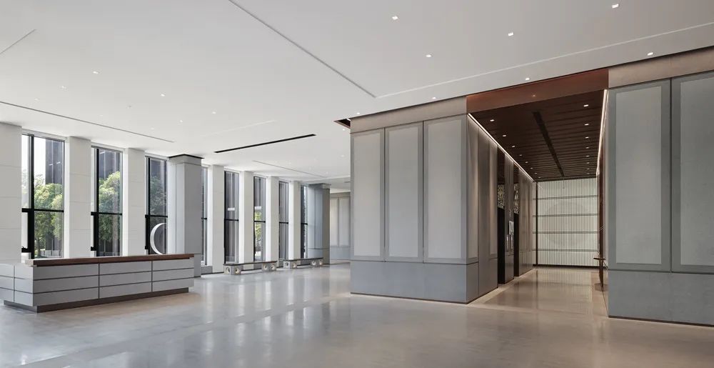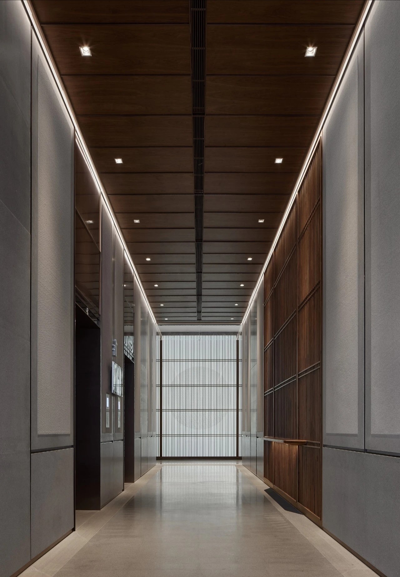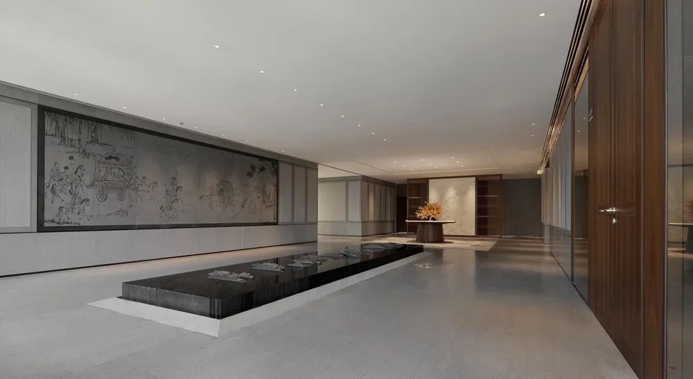 空间设计运用线性构成规划简明利落的极简格调,再用大面积灰、白红色调穿插在其中,借助温暖的灯光设计,营造出静谧优雅、庄严凝重的空间感觉与氛围。