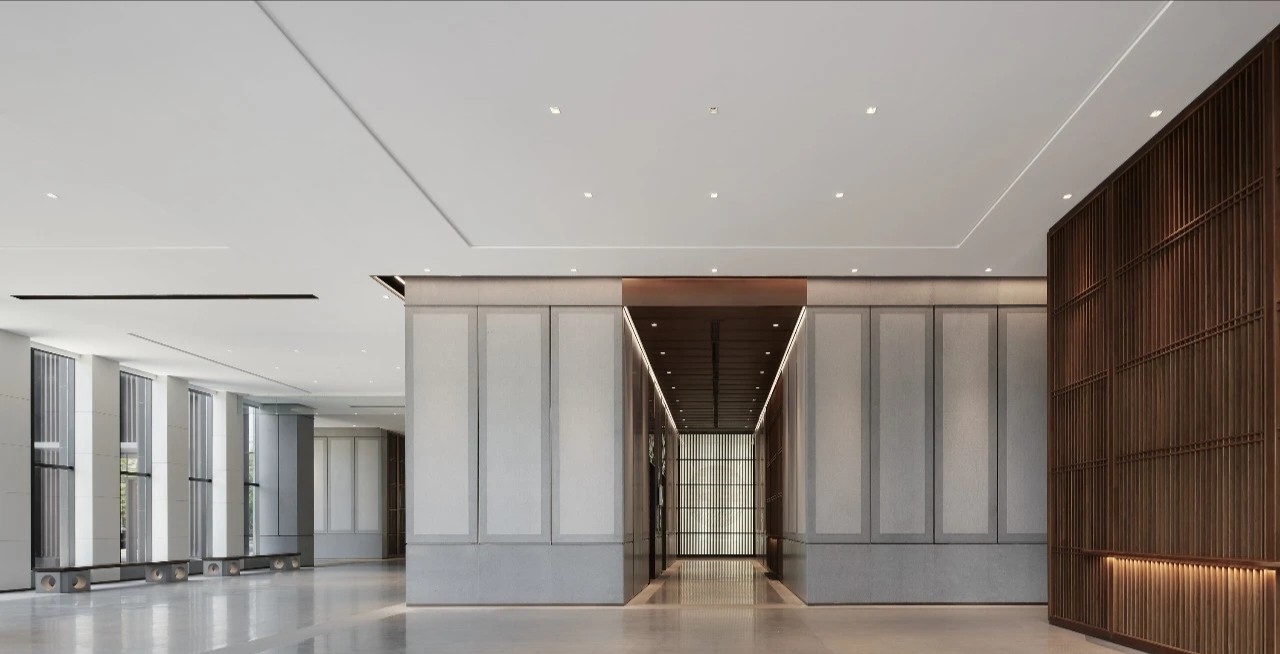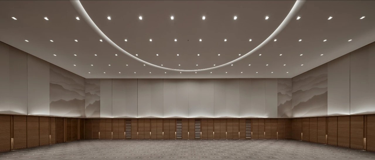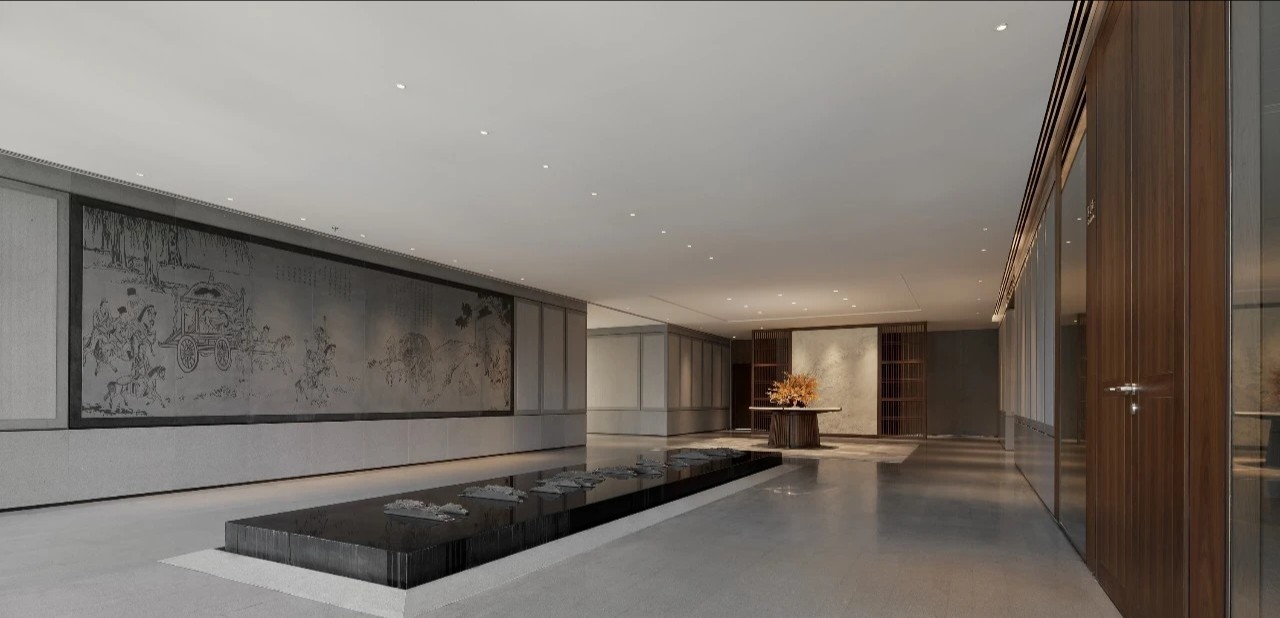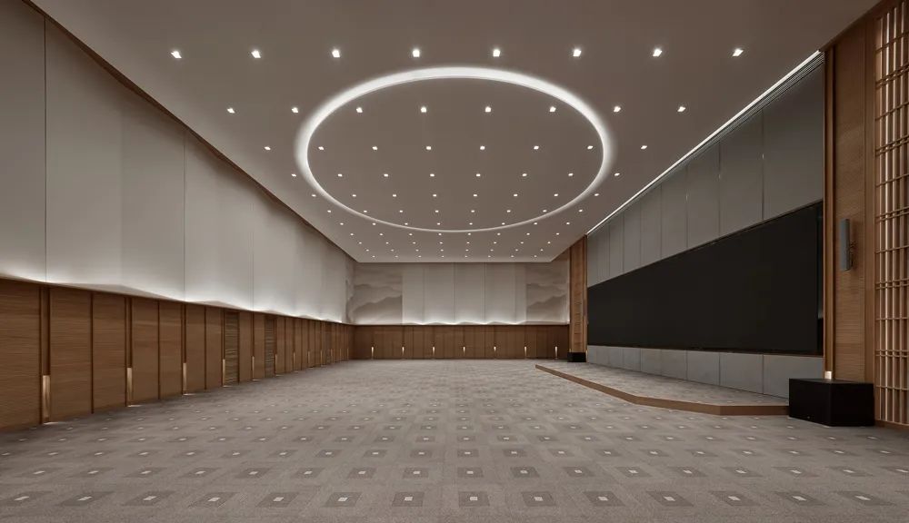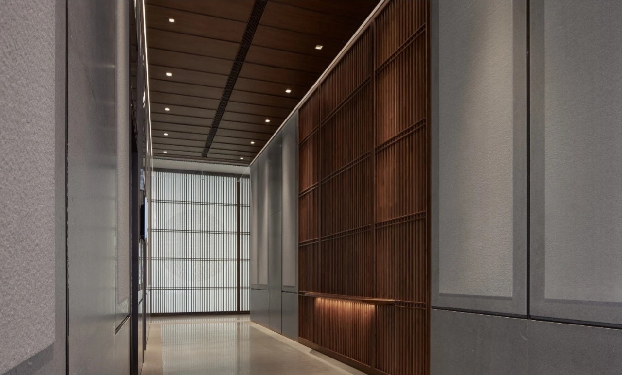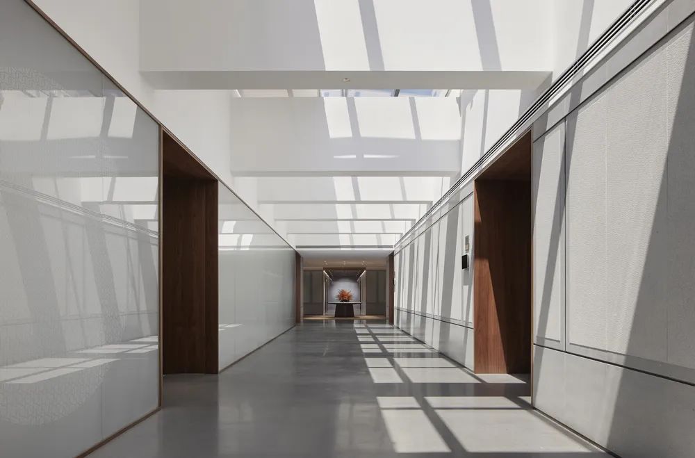 空间设计运用线性构成规划简明利落的极简格调,再用大面积灰、白红色调穿插在其中,借助温暖的灯光设计,营造出静谧优雅、庄严凝重的空间感觉与氛围。