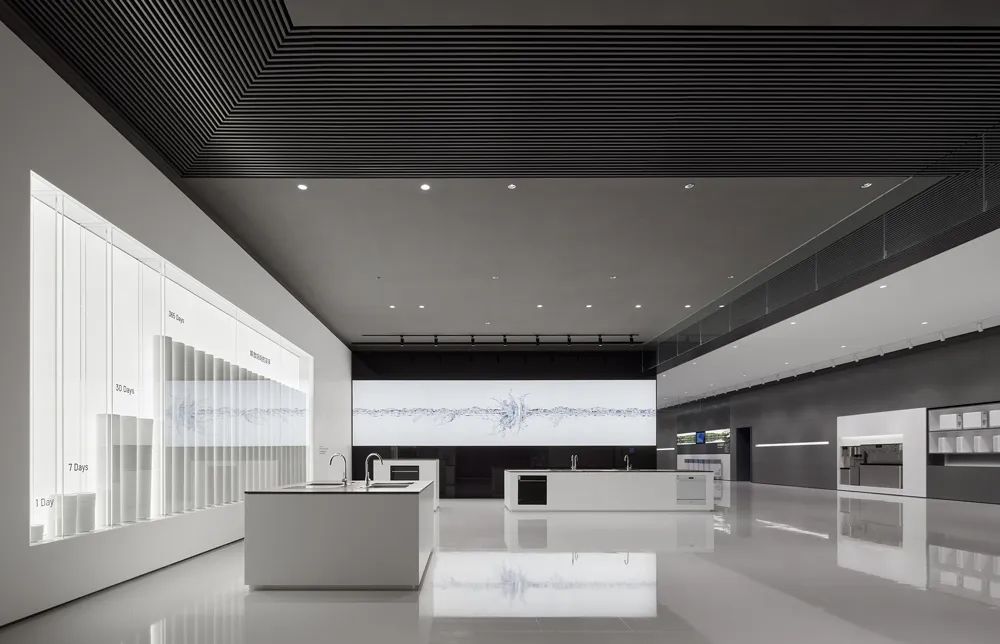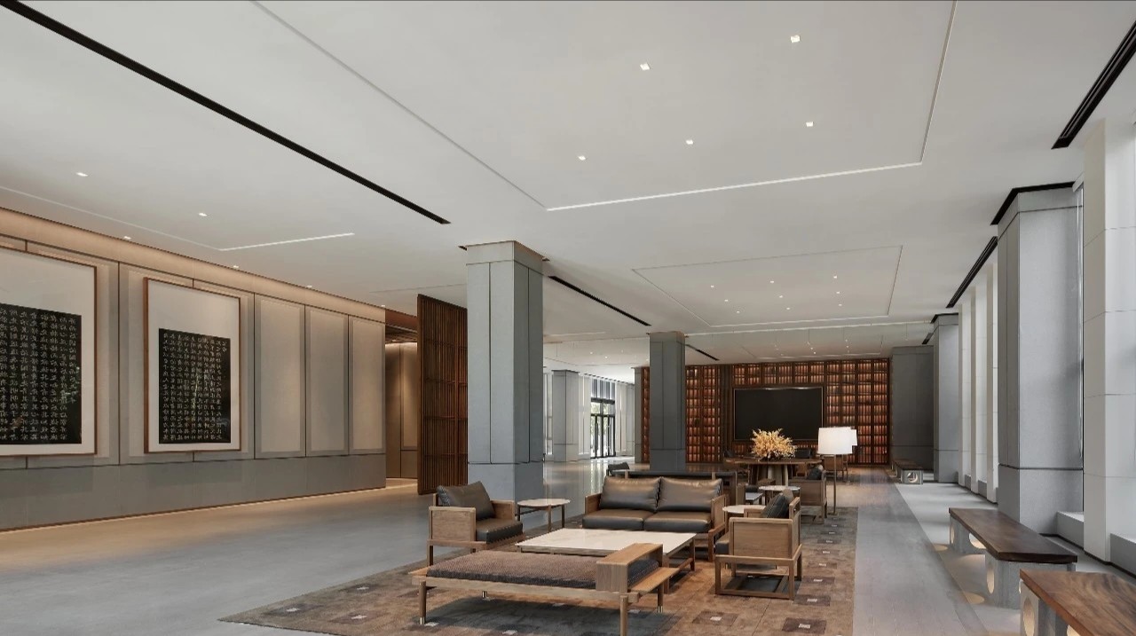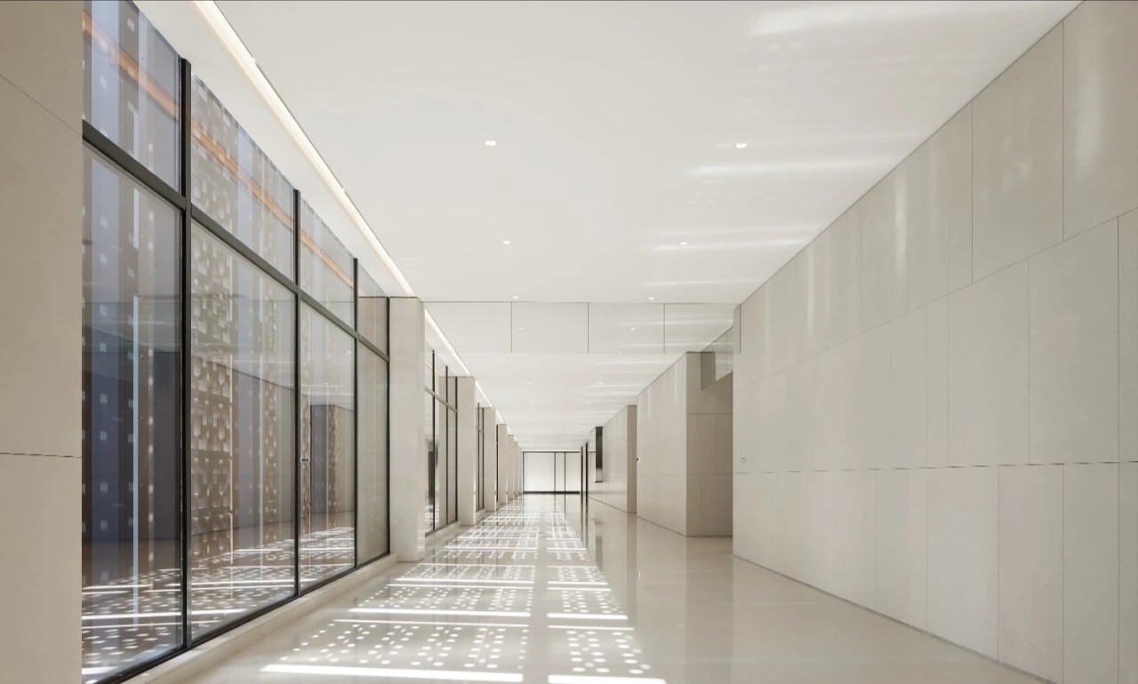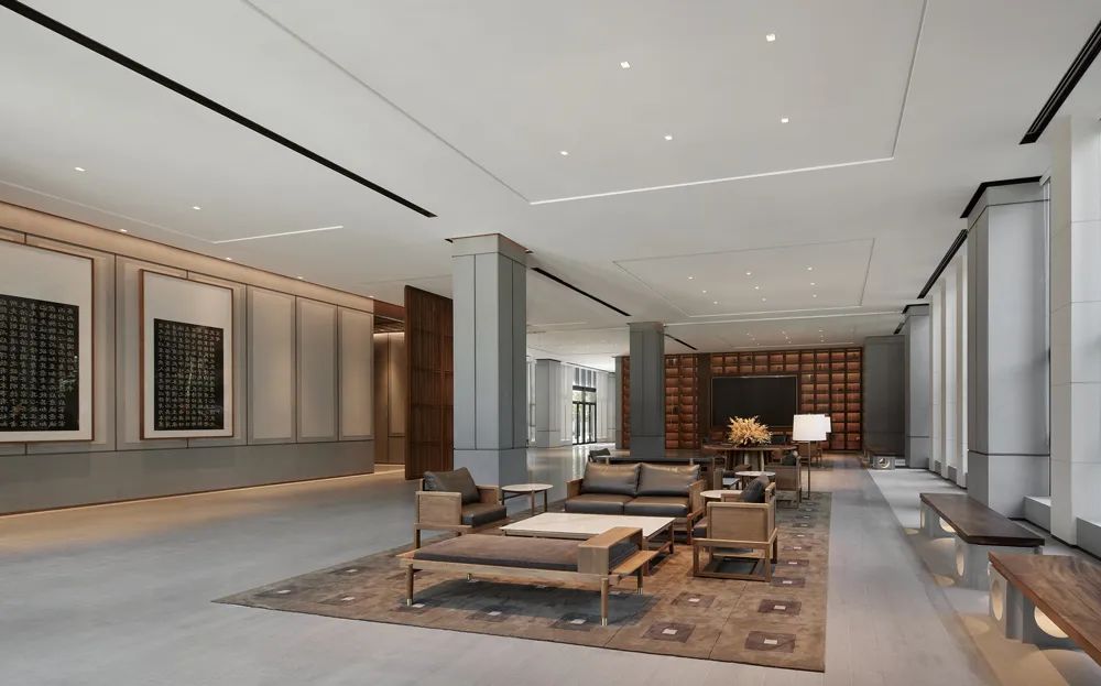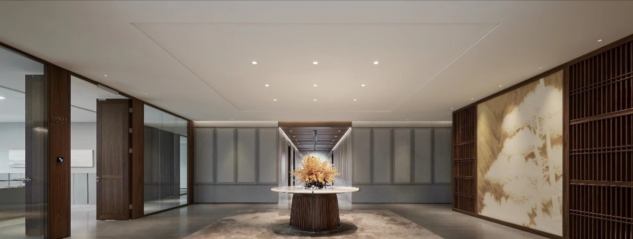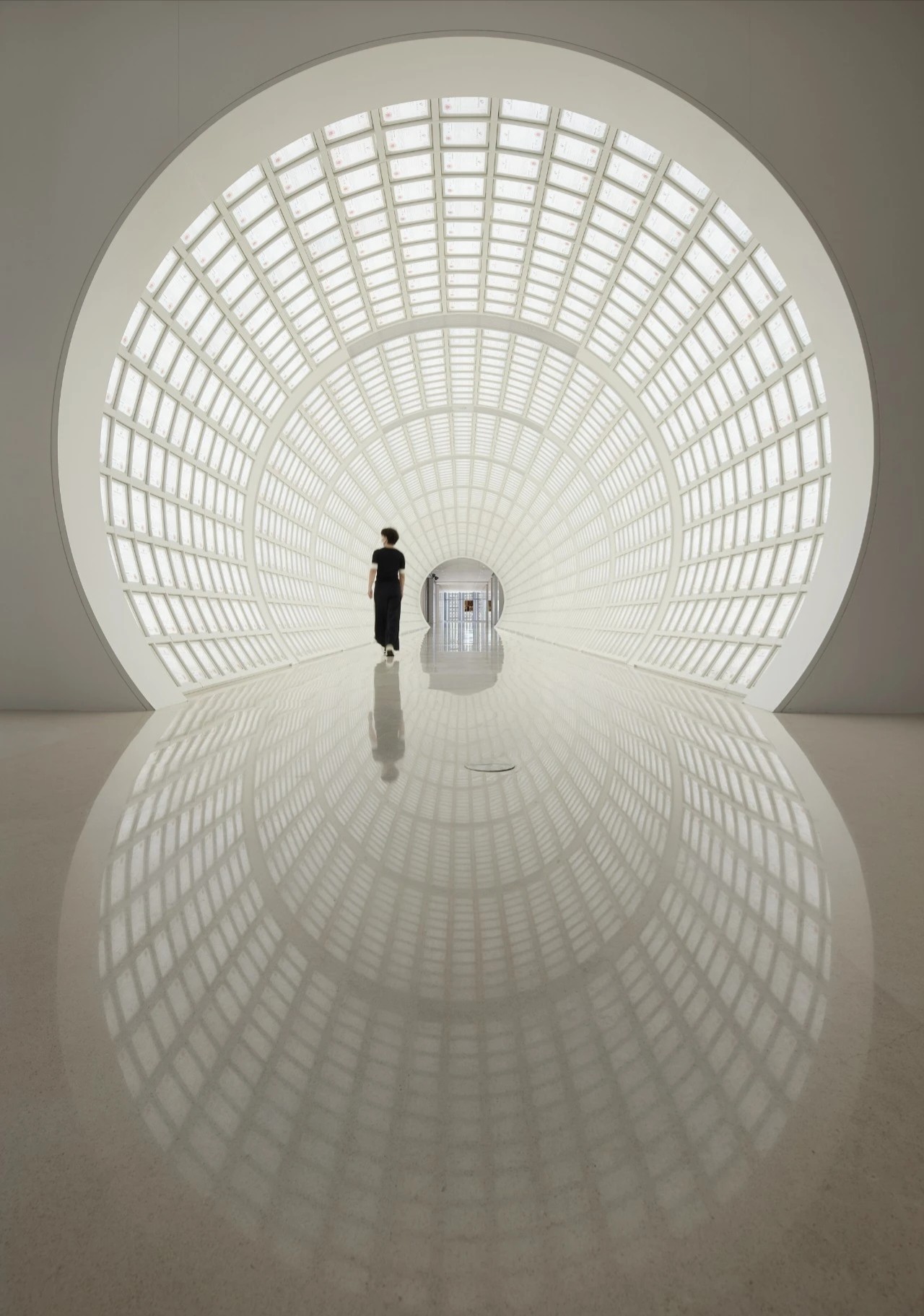 空间设计运用线性构成规划简明利落的极简格调,再用大面积灰、白红色调穿插在其中,借助温暖的灯光设计,营造出静谧优雅、庄严凝重的空间感觉与氛围。